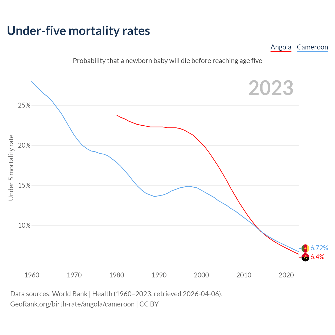 The chance that a newborn baby will die before reaching age five is 6.4% in Angola and 6.72% in Cameroon. Above is a chart with historical data on under-five mortality rates.
