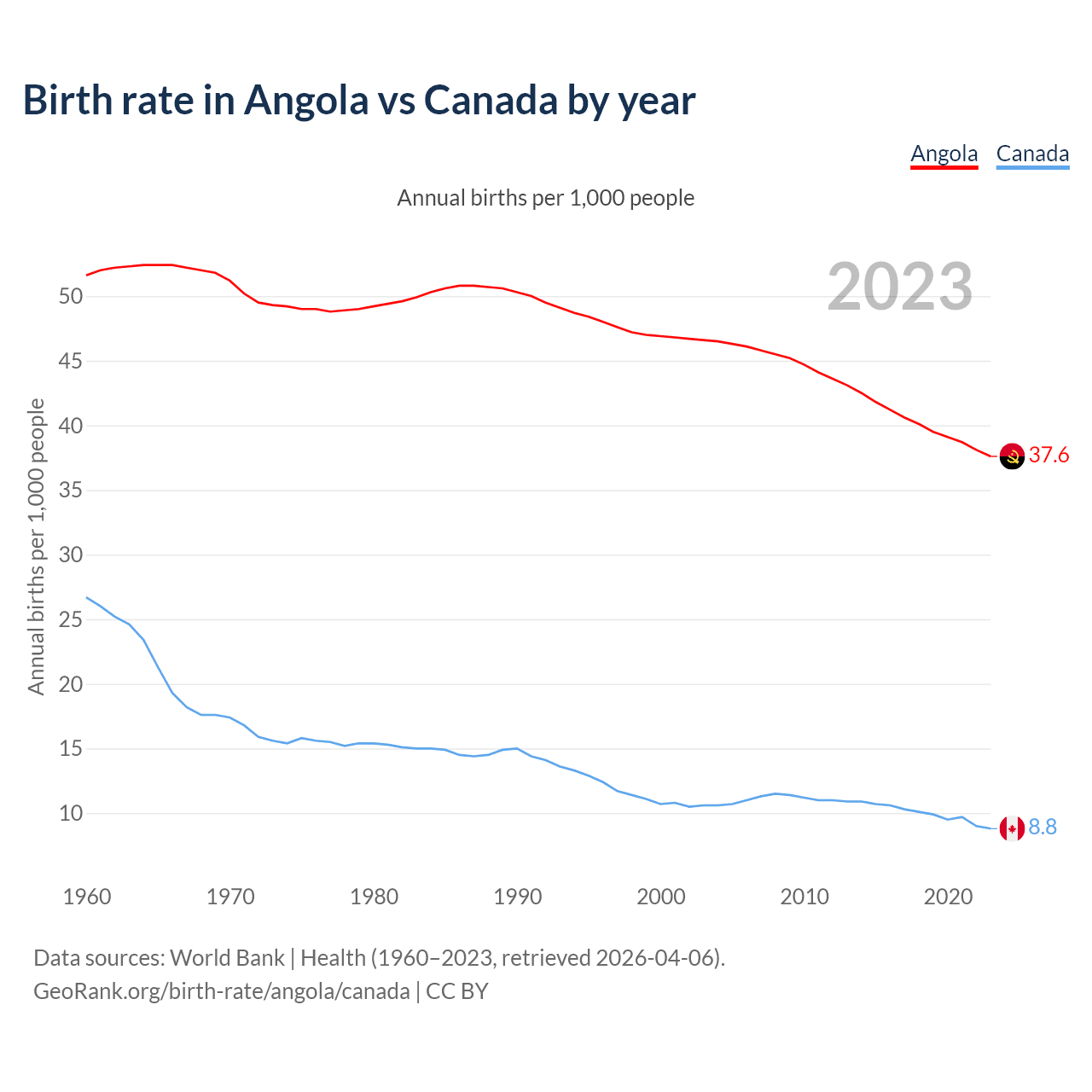 Angola has an annual birth rate of 37.6 births per 1,000 people, compared to 8.8 for Canada. The average number of children a woman is expected to have during her lifetime — the fertility rate, is 5.12 in Angola and 1.26 in Canada — 75.4% difference.