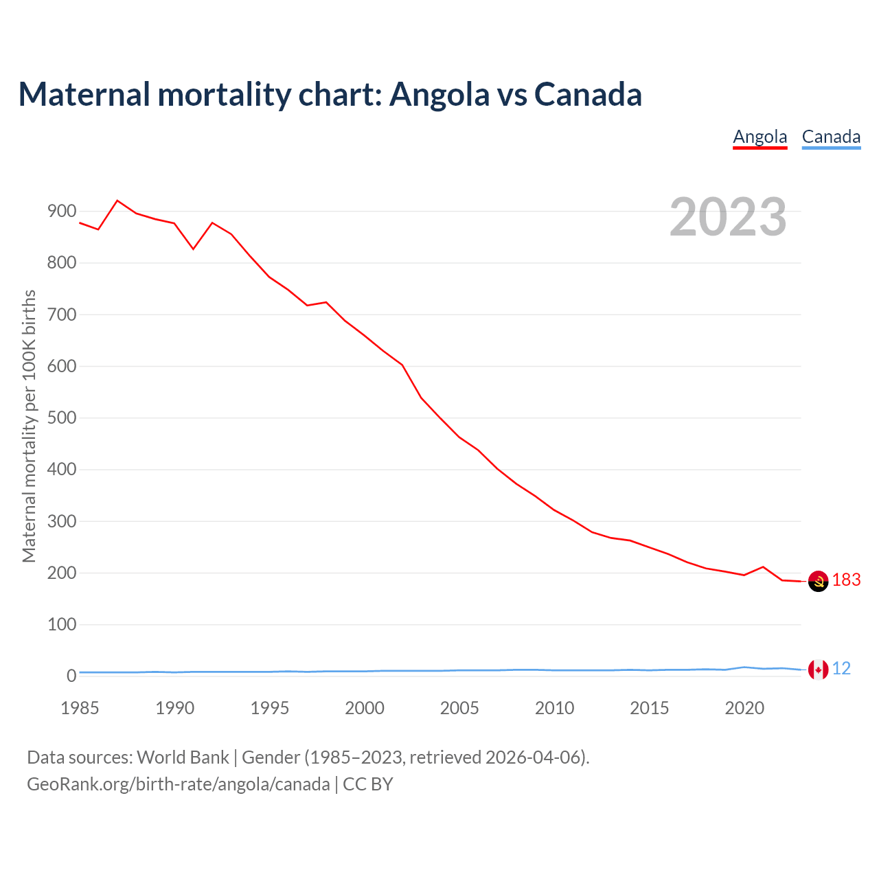 The maternal mortality rate, which is the probability of dying during childbirth or within 42 days of pregnancy termination, is 183 deaths per 100,000 live births in Angola, compared to 12 deaths in Canada.