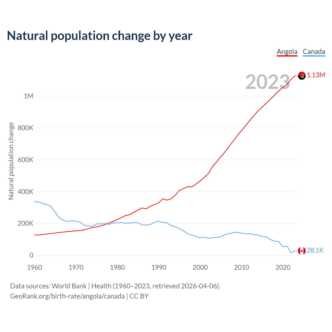 According to the latest available data on birth rates, the fertility rate in Angola was 5.12 children per woman in 2023, compared to 1.26 in Canada in 2023. The replacement level is considered to be 2.1 children per woman.