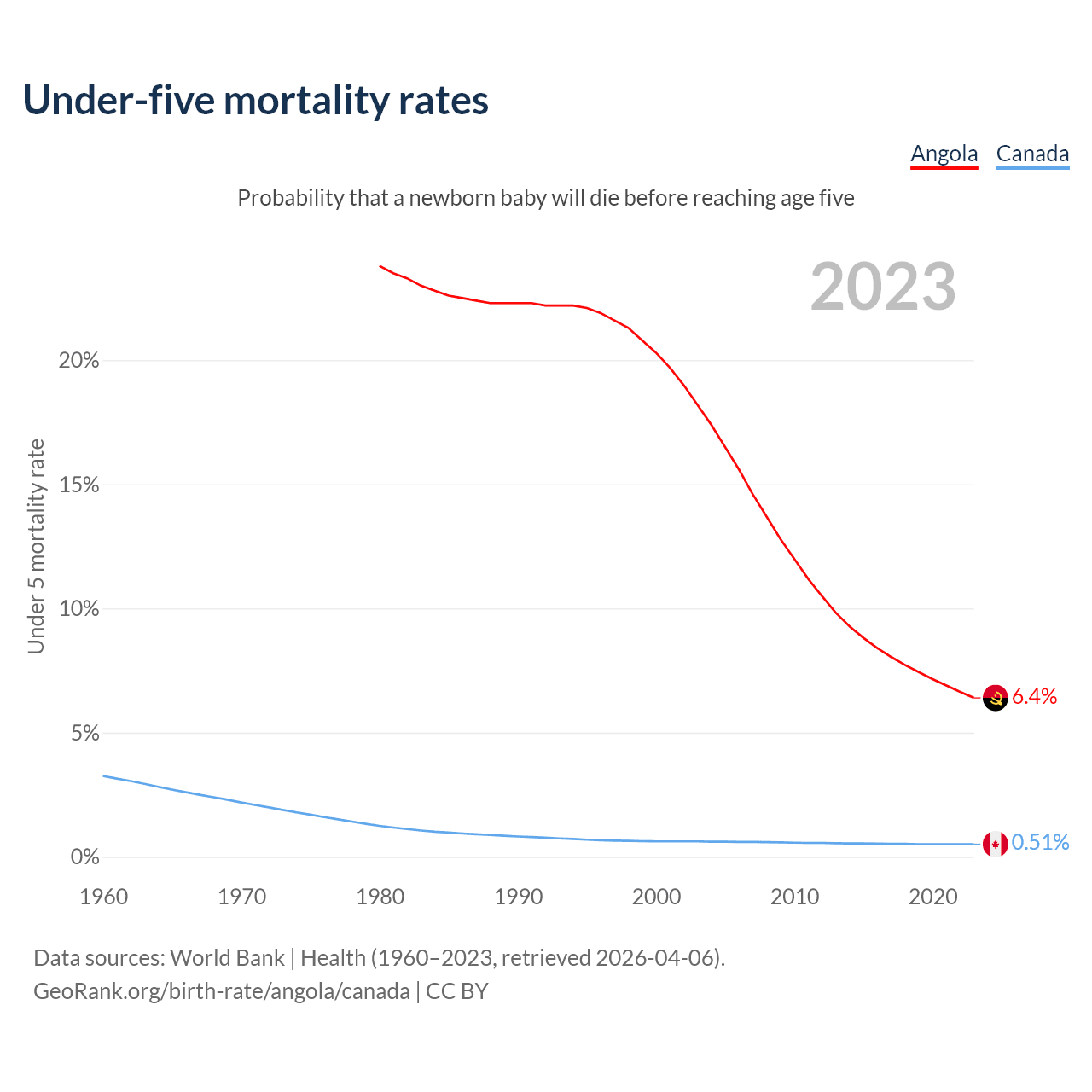 The chance that a newborn baby will die before reaching age five is 6.4% in Angola and 0.51% in Canada. Above is a chart with historical data on under-five mortality rates.