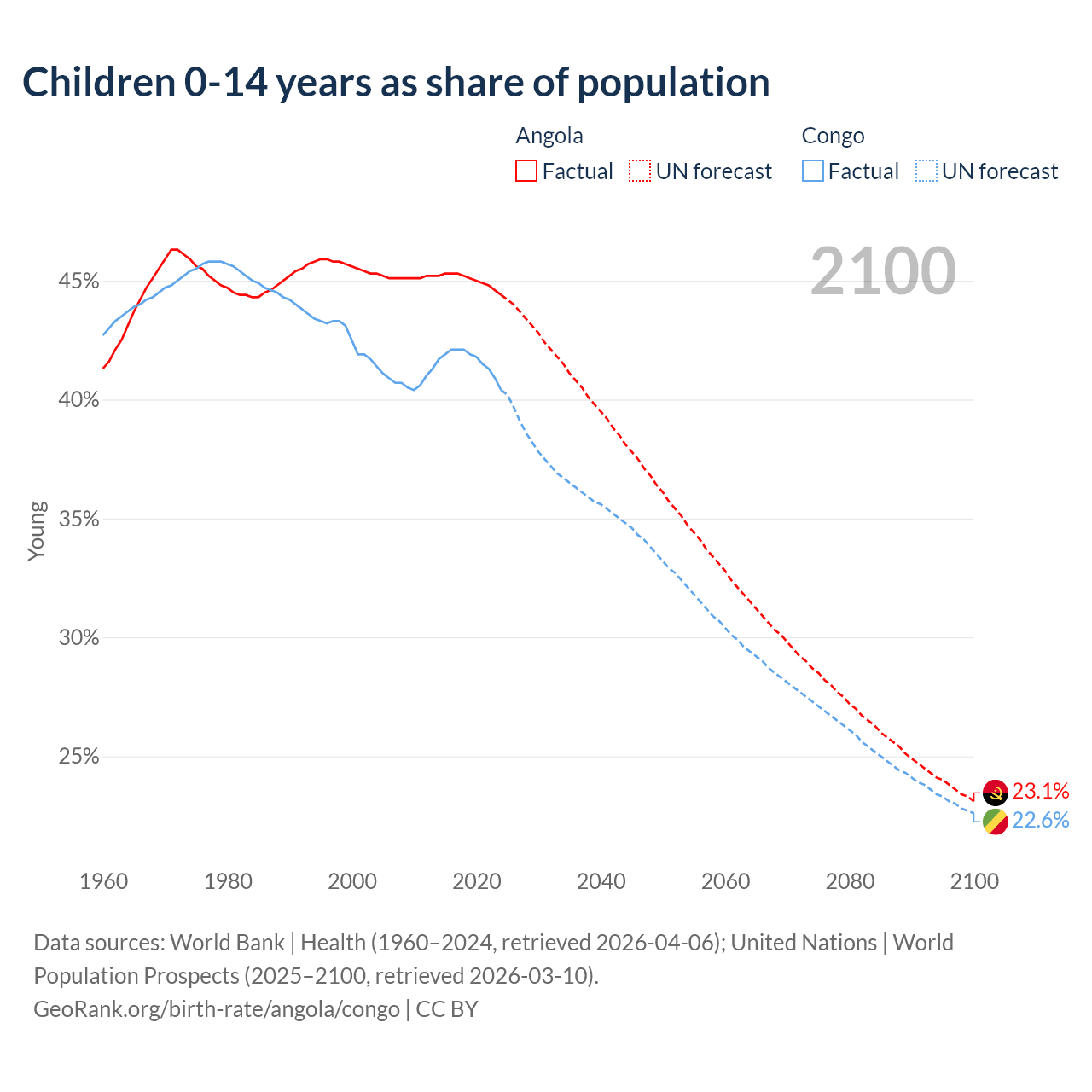 1960 vs 2023, the fertility rate has decreased by 23.6% in Angola and by 31.7% in the Congo — in 1960, it was 6.71 and 6.09, respectively.