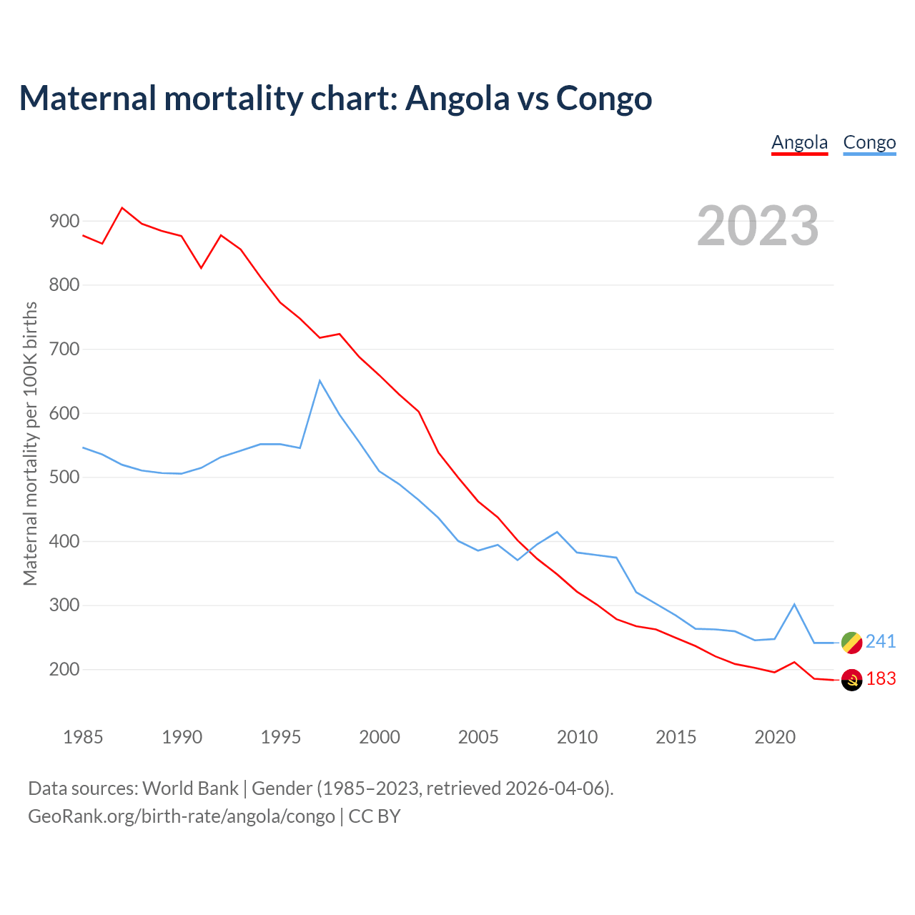 The maternal mortality rate, which is the probability of dying during childbirth or within 42 days of pregnancy termination, is 183 deaths per 100,000 live births in Angola, compared to 241 deaths in the Congo.
