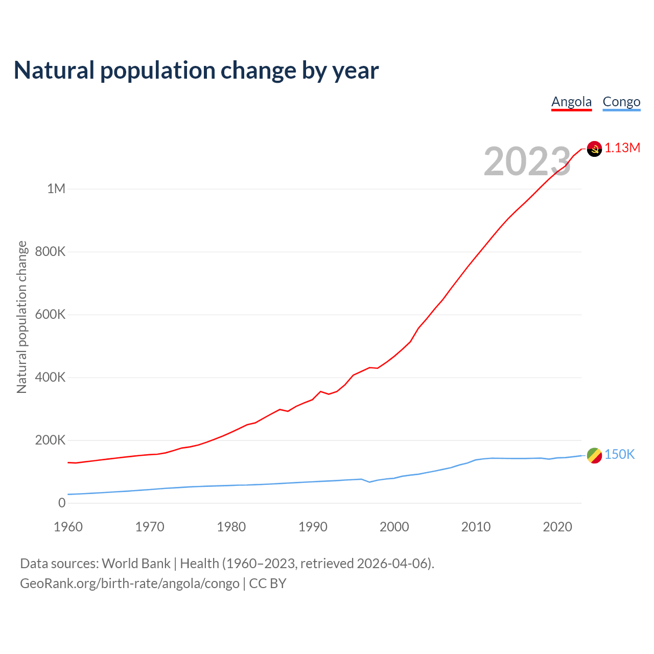 According to the latest available data on birth rates, the fertility rate in Angola was 5.12 children per woman in 2023, compared to 4.16 in the Congo in 2023. The replacement level is considered to be 2.1 children per woman.