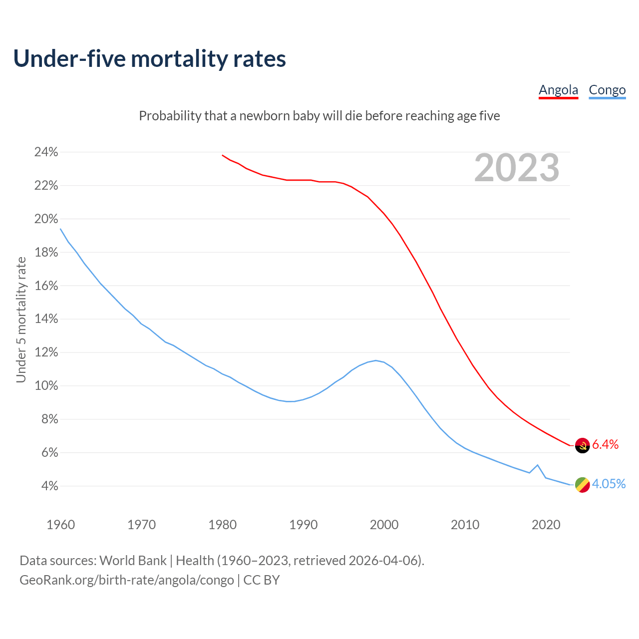 The chance that a newborn baby will die before reaching age five is 6.4% in Angola and 4.05% in the Congo. Above is a chart with historical data on under-five mortality rates.