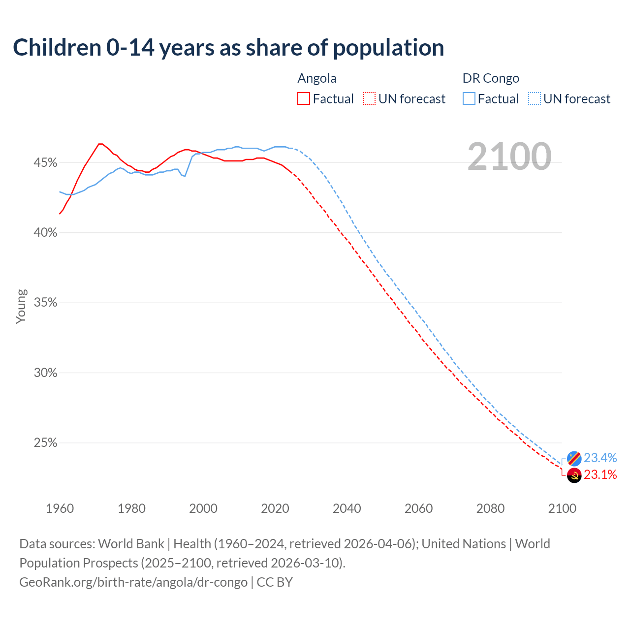 According to the latest available data on birth rates, the fertility rate in Angola was 5.12 children per woman in 2023, compared to 6.05 in the DR Congo in 2023. The replacement level is considered to be 2.1 children per woman.