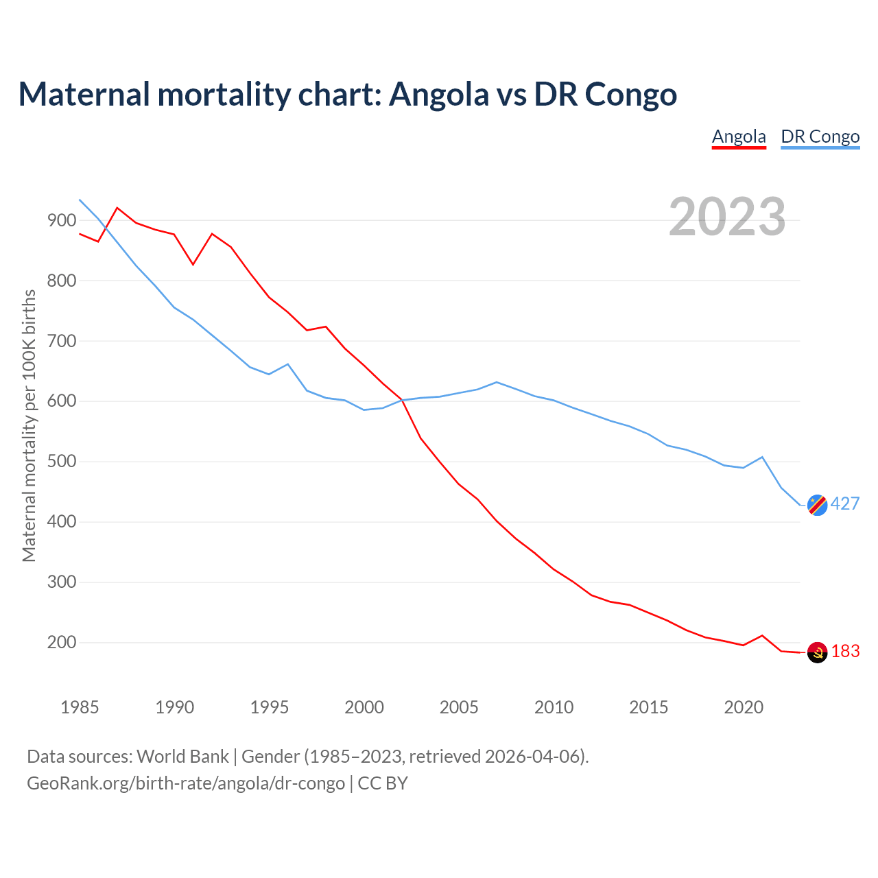 The maternal mortality rate, which is the probability of dying during childbirth or within 42 days of pregnancy termination, is 183 deaths per 100,000 live births in Angola, compared to 427 deaths in the DR Congo.