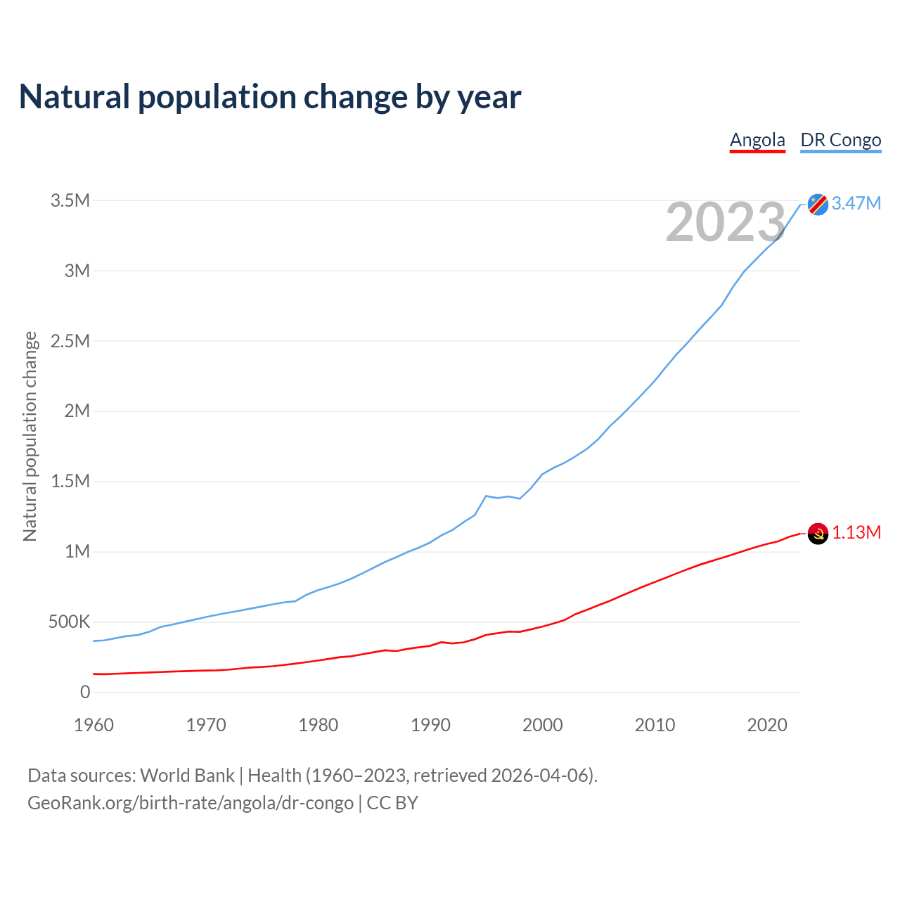 Angola has an annual birth rate of 37.6 births per 1,000 people, compared to 41.3 for the DR Congo. The average number of children a woman is expected to have during her lifetime — the fertility rate, is 5.12 in Angola and 6.05 in the DR Congo — 18.1% difference.
