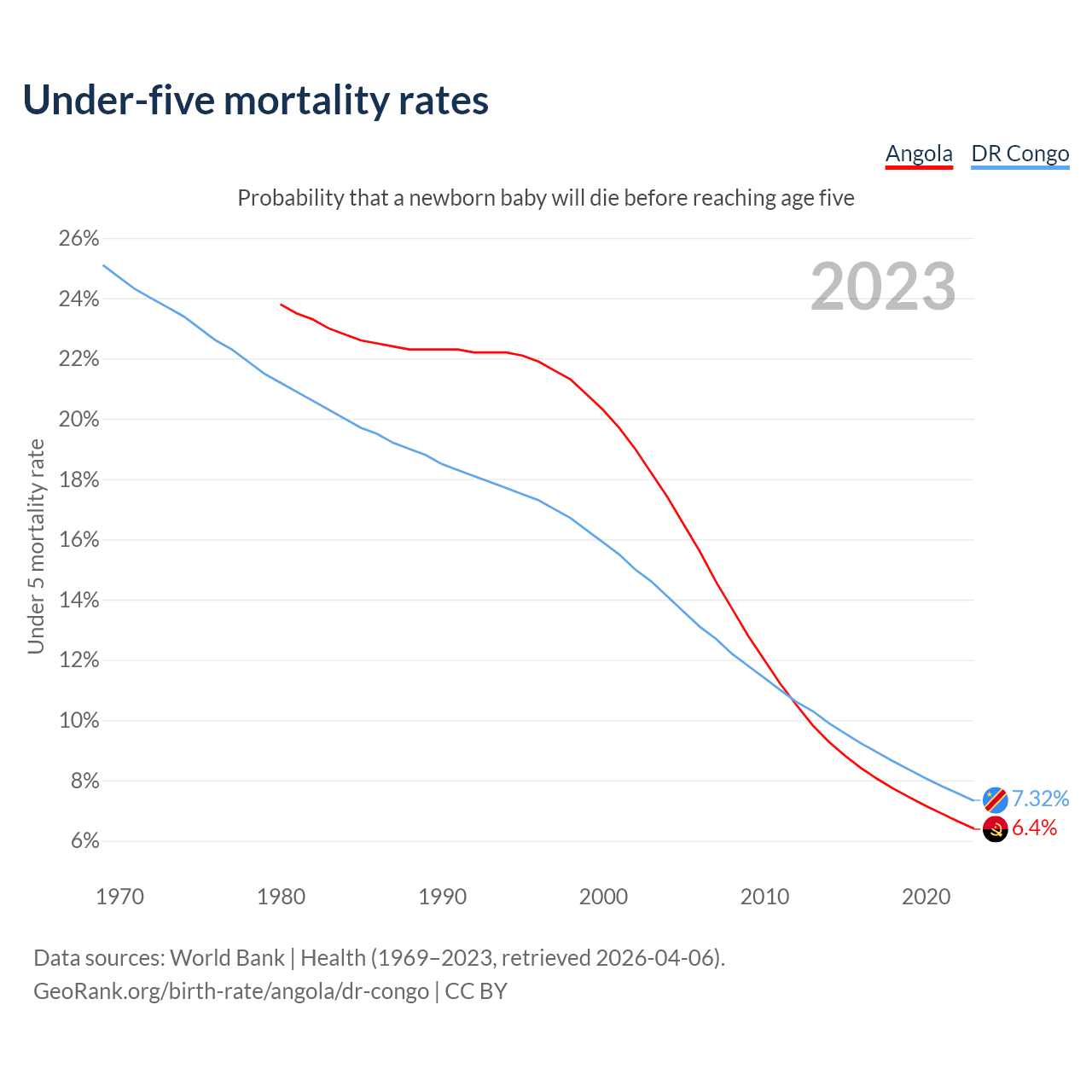 The chance that a newborn baby will die before reaching age five is 6.4% in Angola and 7.32% in the DR Congo. Above is a chart with historical data on under-five mortality rates.