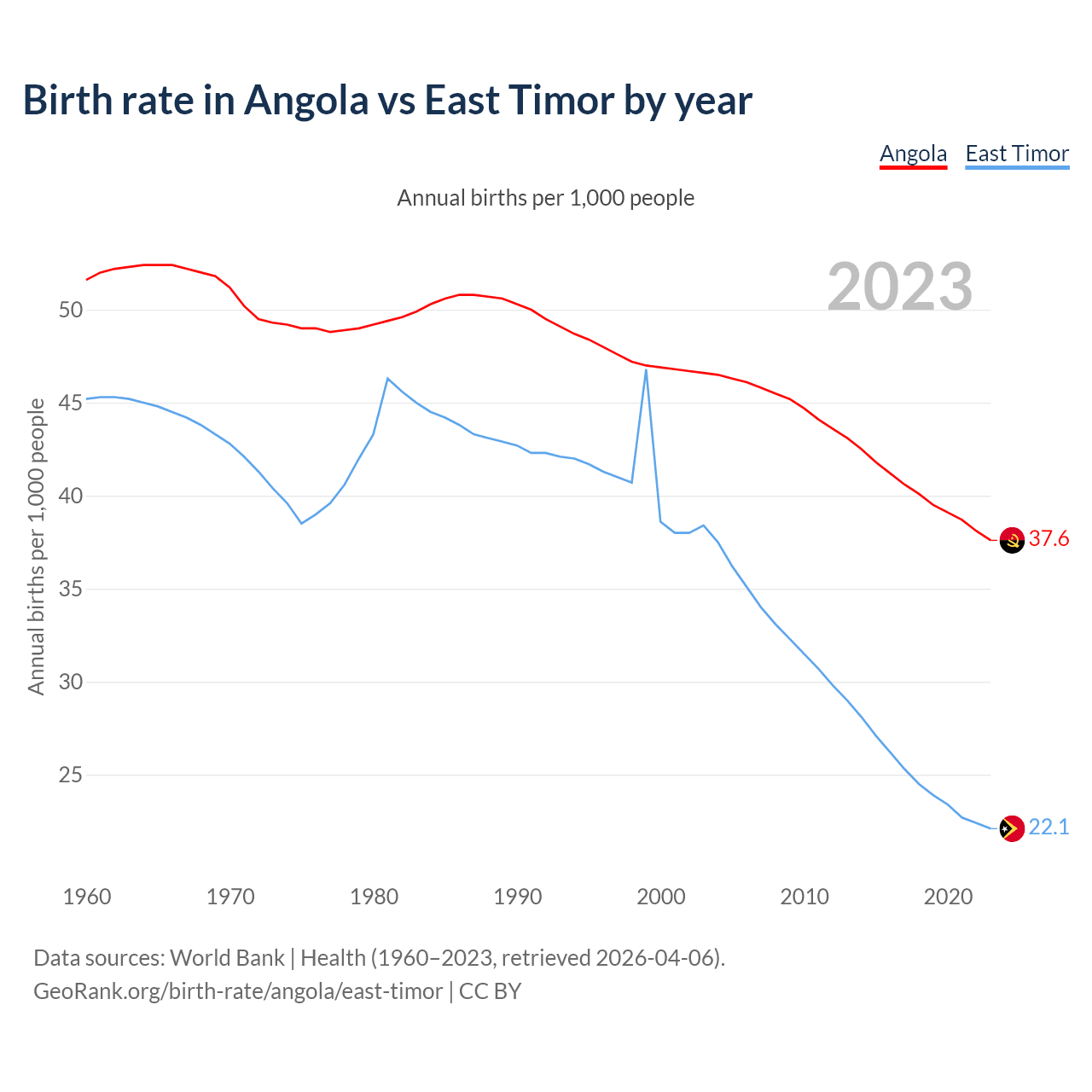 Angola has an annual birth rate of 37.6 births per 1,000 people, compared to 22.1 for East Timor. The average number of children a woman is expected to have during her lifetime — the fertility rate, is 5.12 in Angola and 2.71 in East Timor — 47.2% difference.