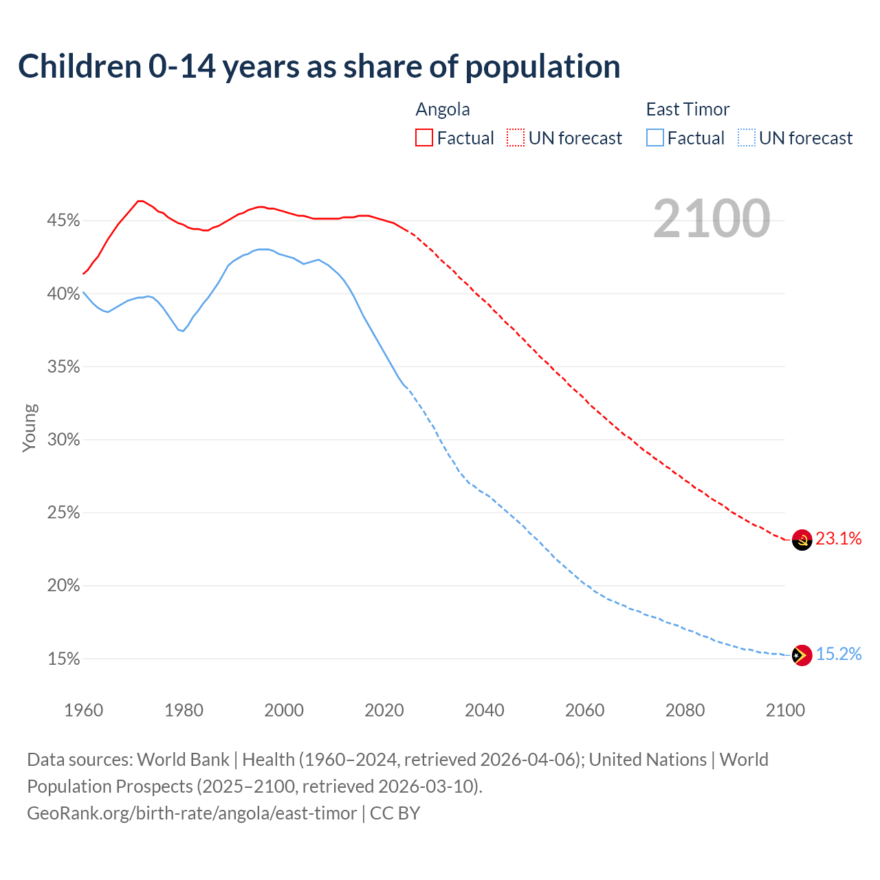 According to the latest available data on birth rates, the fertility rate in Angola was 5.12 children per woman in 2023, compared to 2.71 in East Timor in 2023. The replacement level is considered to be 2.1 children per woman.