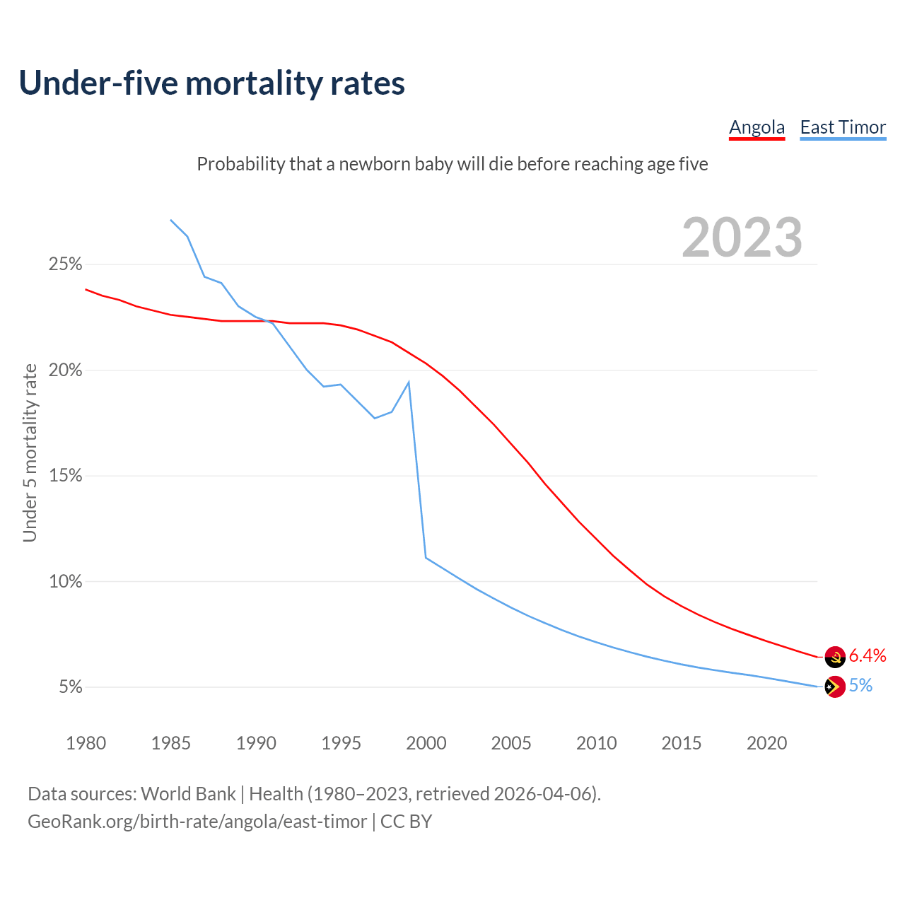 The chance that a newborn baby will die before reaching age five is 6.4% in Angola and 5% in East Timor. Above is a chart with historical data on under-five mortality rates.