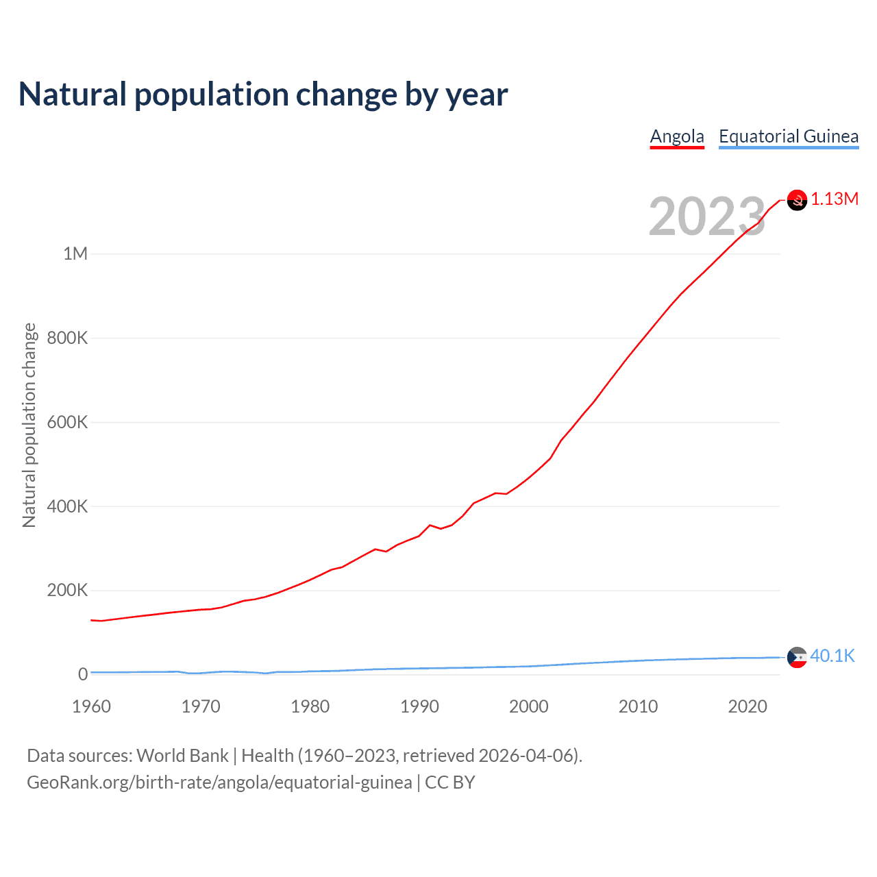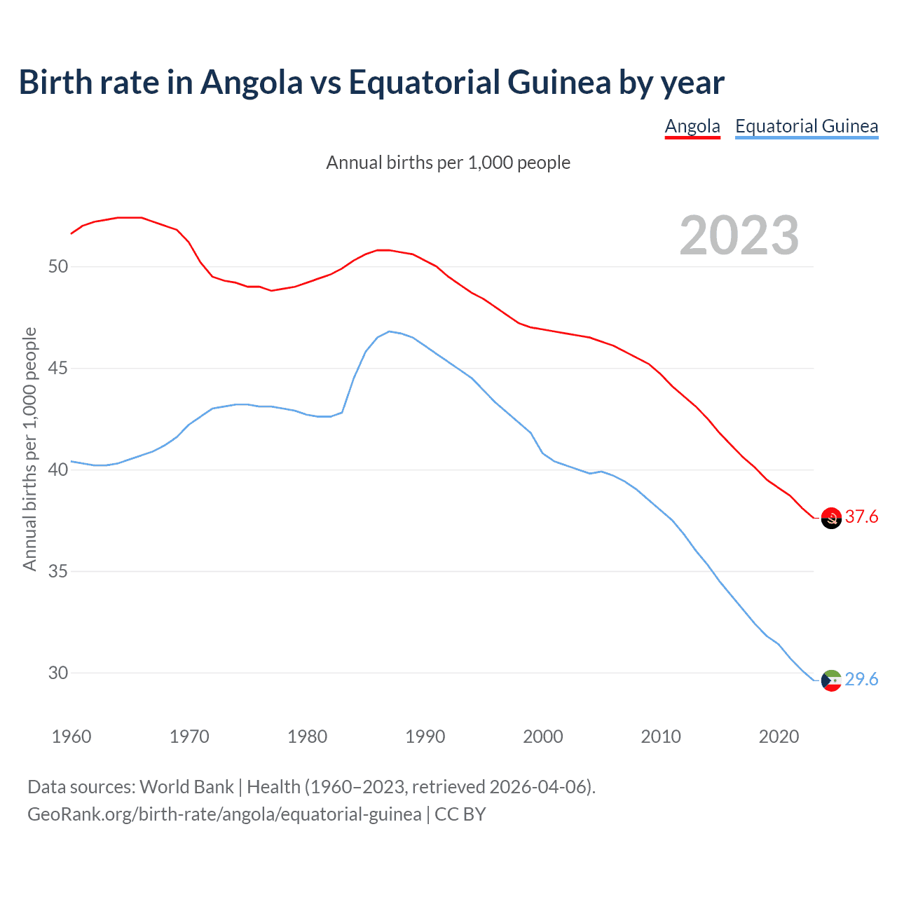 Angola has an annual birth rate of 37.6 births per 1,000 people, compared to 29.6 for Equatorial Guinea. The average number of children a woman is expected to have during her lifetime — the fertility rate, is 5.12 in Angola and 4.08 in Equatorial Guinea — 20.4% difference.