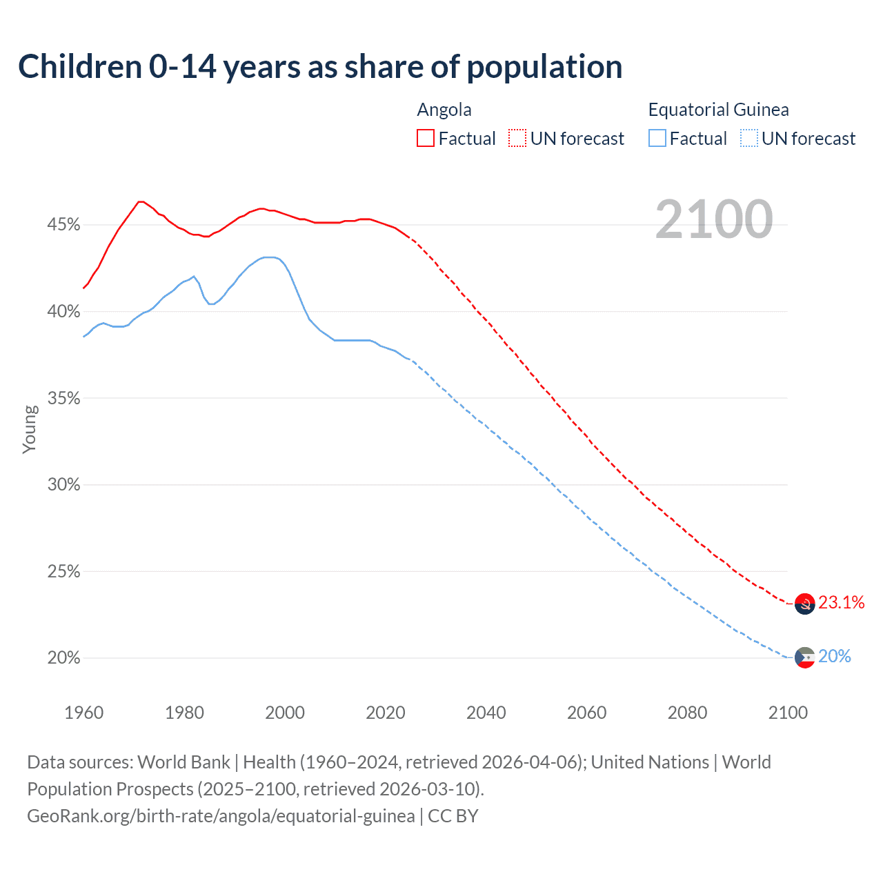 According to the latest available data on birth rates, the fertility rate in Angola was 5.12 children per woman in 2023, compared to 4.08 in Equatorial Guinea in 2023. The replacement level is considered to be 2.1 children per woman.
