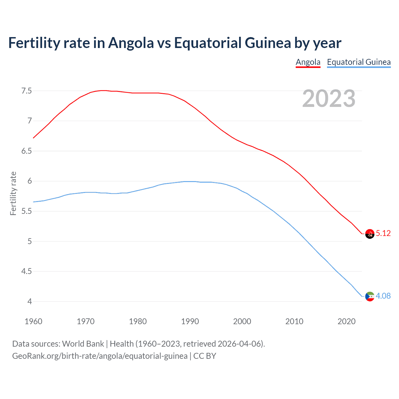 1960 vs 2023, the fertility rate has decreased by 23.6% in Angola and by 27.8% in Equatorial Guinea — in 1960, it was 6.71 and 5.65, respectively.