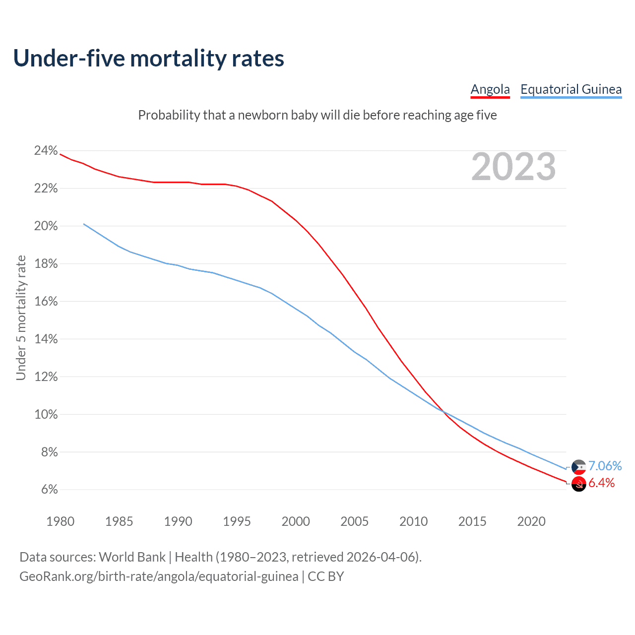 The chance that a newborn baby will die before reaching age five is 6.4% in Angola and 7.06% in Equatorial Guinea. Above is a chart with historical data on under-five mortality rates.