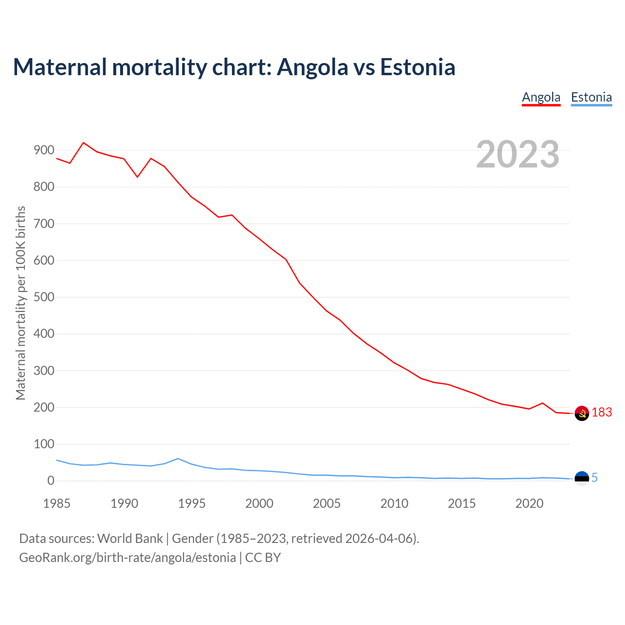 The maternal mortality rate, which is the probability of dying during childbirth or within 42 days of pregnancy termination, is 183 deaths per 100,000 live births in Angola, compared to 5 deaths in Estonia.