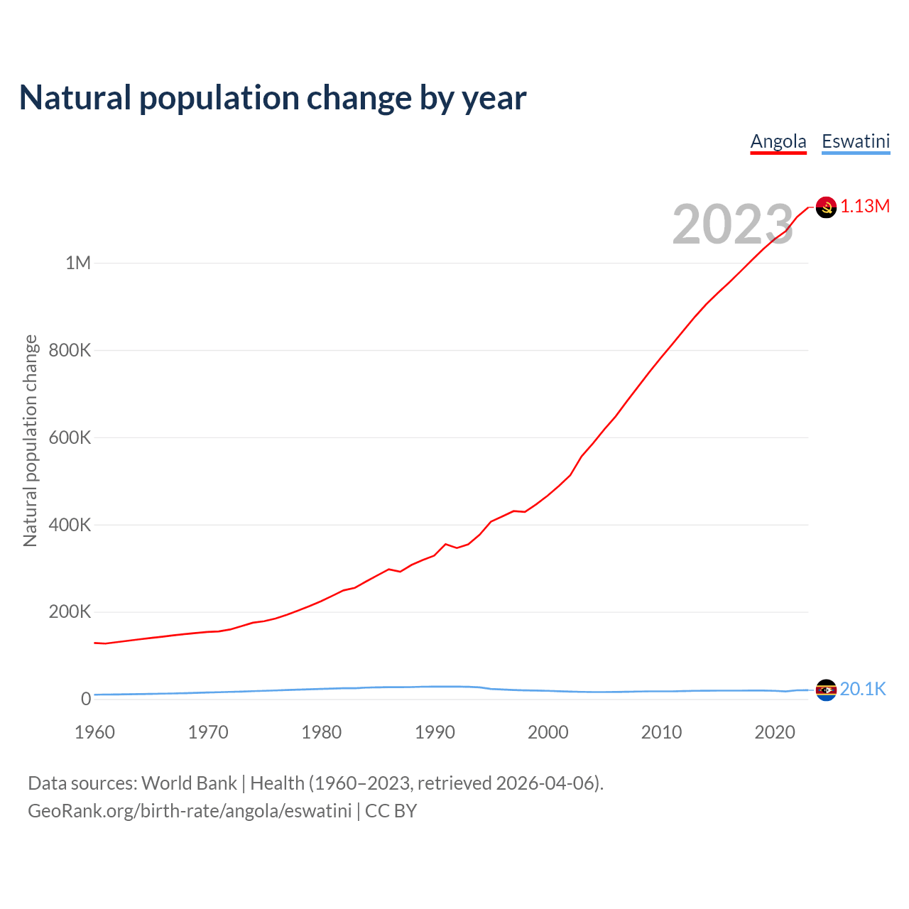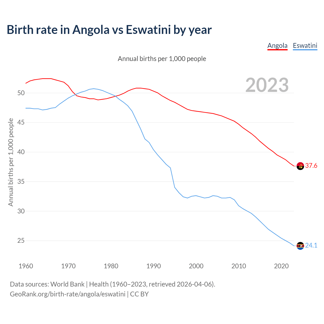 Angola has an annual birth rate of 37.6 births per 1,000 people, compared to 24.1 for Eswatini. The average number of children a woman is expected to have during her lifetime — the fertility rate, is 5.12 in Angola and 2.75 in Eswatini — 46.3% difference.
