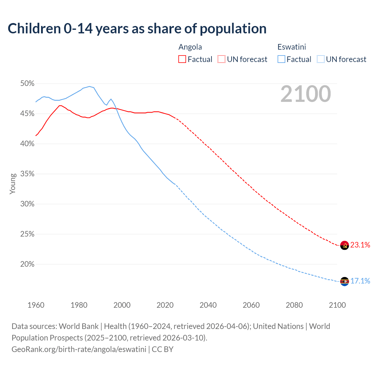 According to the latest available data on birth rates, the fertility rate in Angola was 5.12 children per woman in 2023, compared to 2.75 in Eswatini in 2023. The replacement level is considered to be 2.1 children per woman.