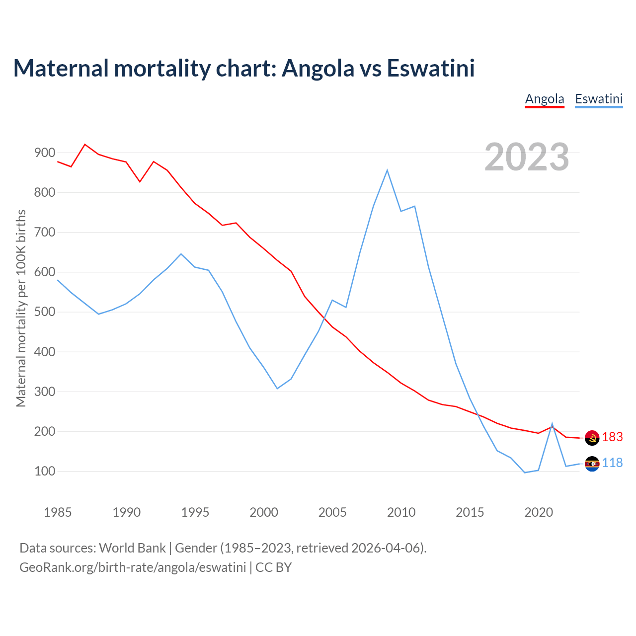 The maternal mortality rate, which is the probability of dying during childbirth or within 42 days of pregnancy termination, is 183 deaths per 100,000 live births in Angola, compared to 118 deaths in Eswatini.
