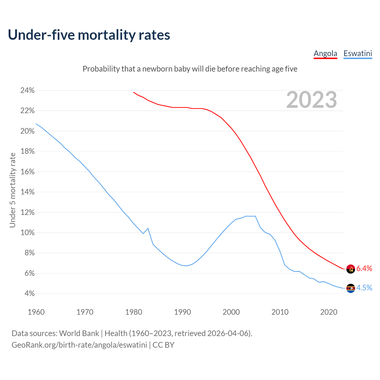 The chance that a newborn baby will die before reaching age five is 6.4% in Angola and 4.5% in Eswatini. Above is a chart with historical data on under-five mortality rates.