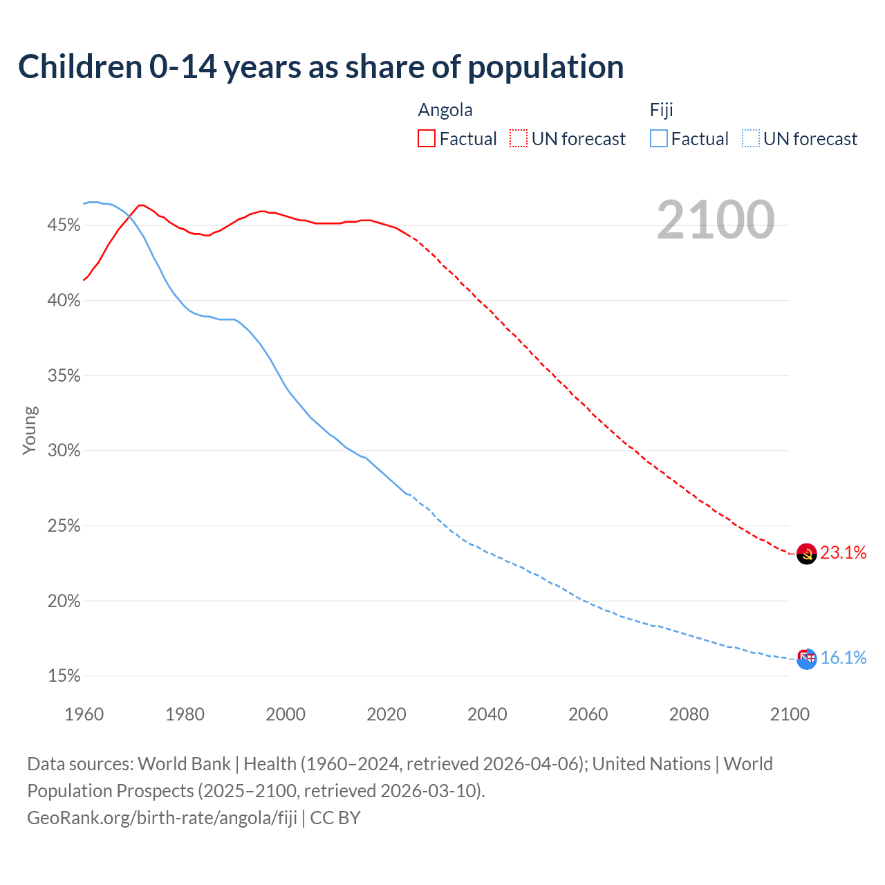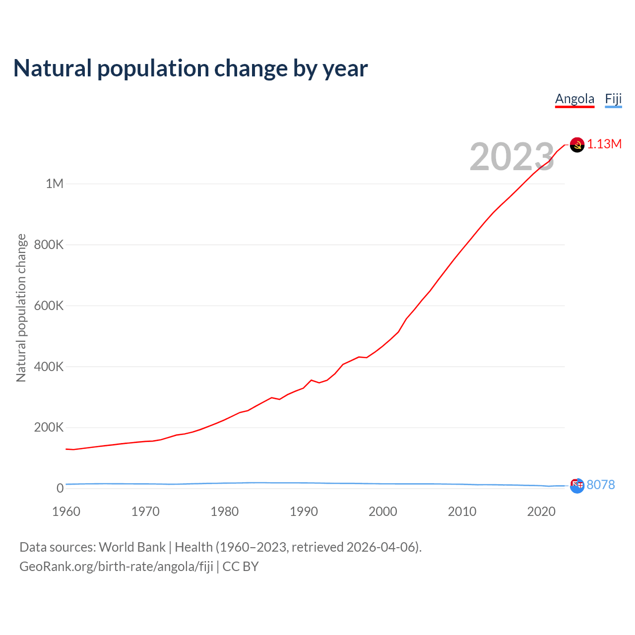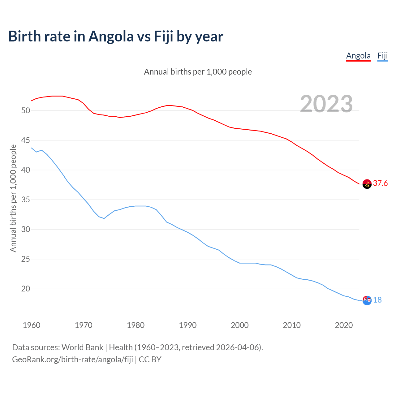 Angola has an annual birth rate of 37.6 births per 1,000 people, compared to 18 for Fiji. The average number of children a woman is expected to have during her lifetime — the fertility rate, is 5.12 in Angola and 2.28 in Fiji — 55.5% difference.
