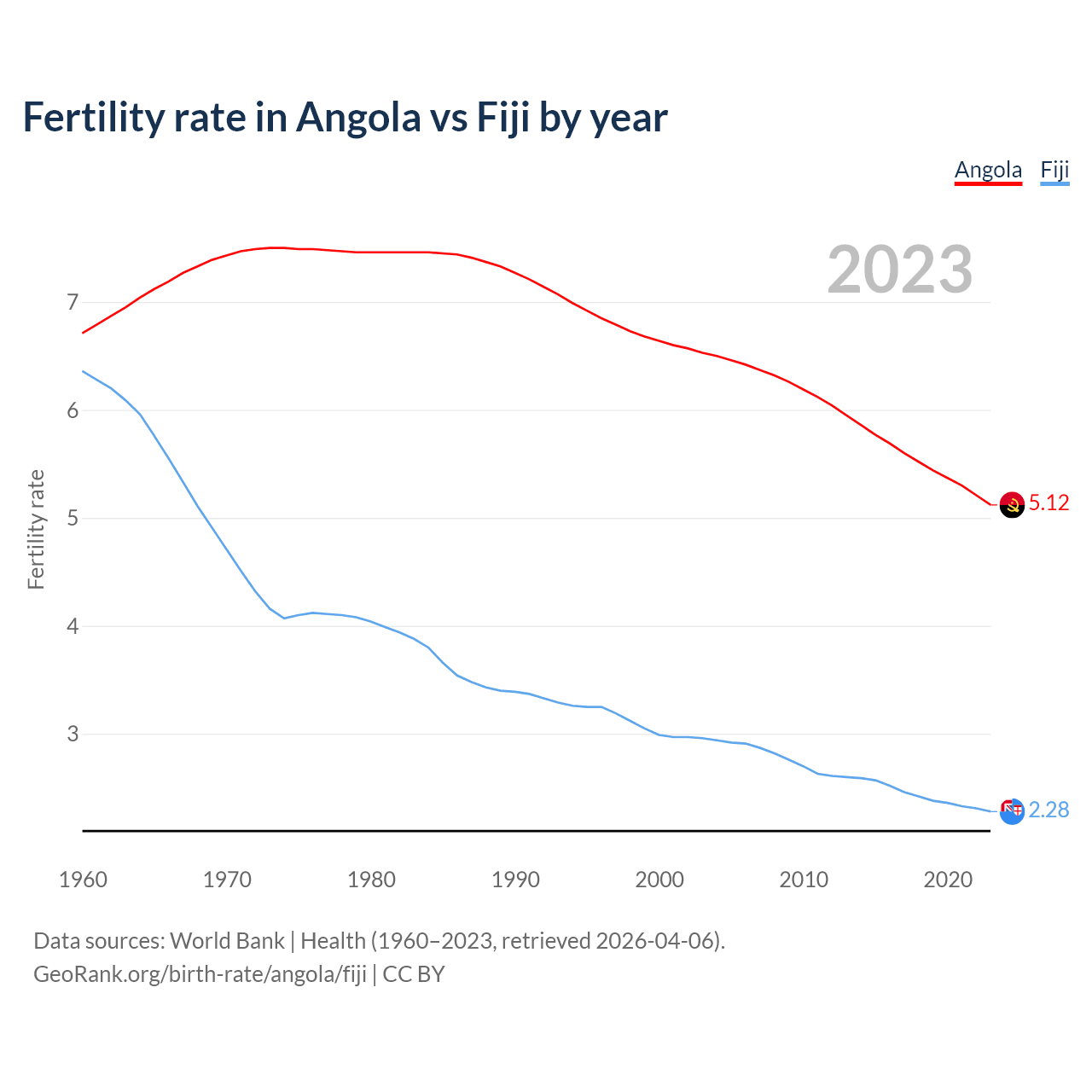 According to the latest available data on birth rates, the fertility rate in Angola was 5.12 children per woman in 2023, compared to 2.28 in Fiji in 2023. The replacement level is considered to be 2.1 children per woman.