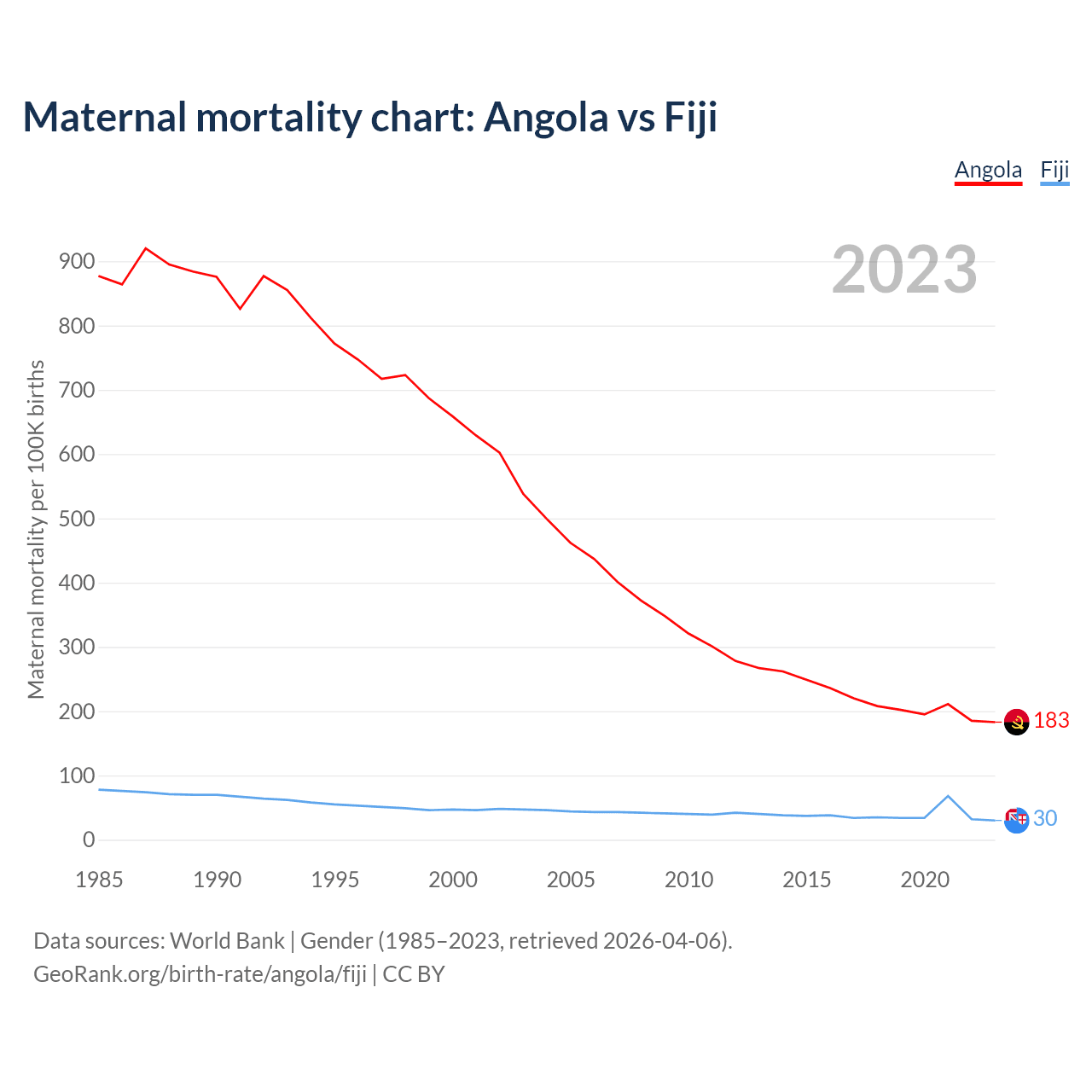 The maternal mortality rate, which is the probability of dying during childbirth or within 42 days of pregnancy termination, is 183 deaths per 100,000 live births in Angola, compared to 30 deaths in Fiji.