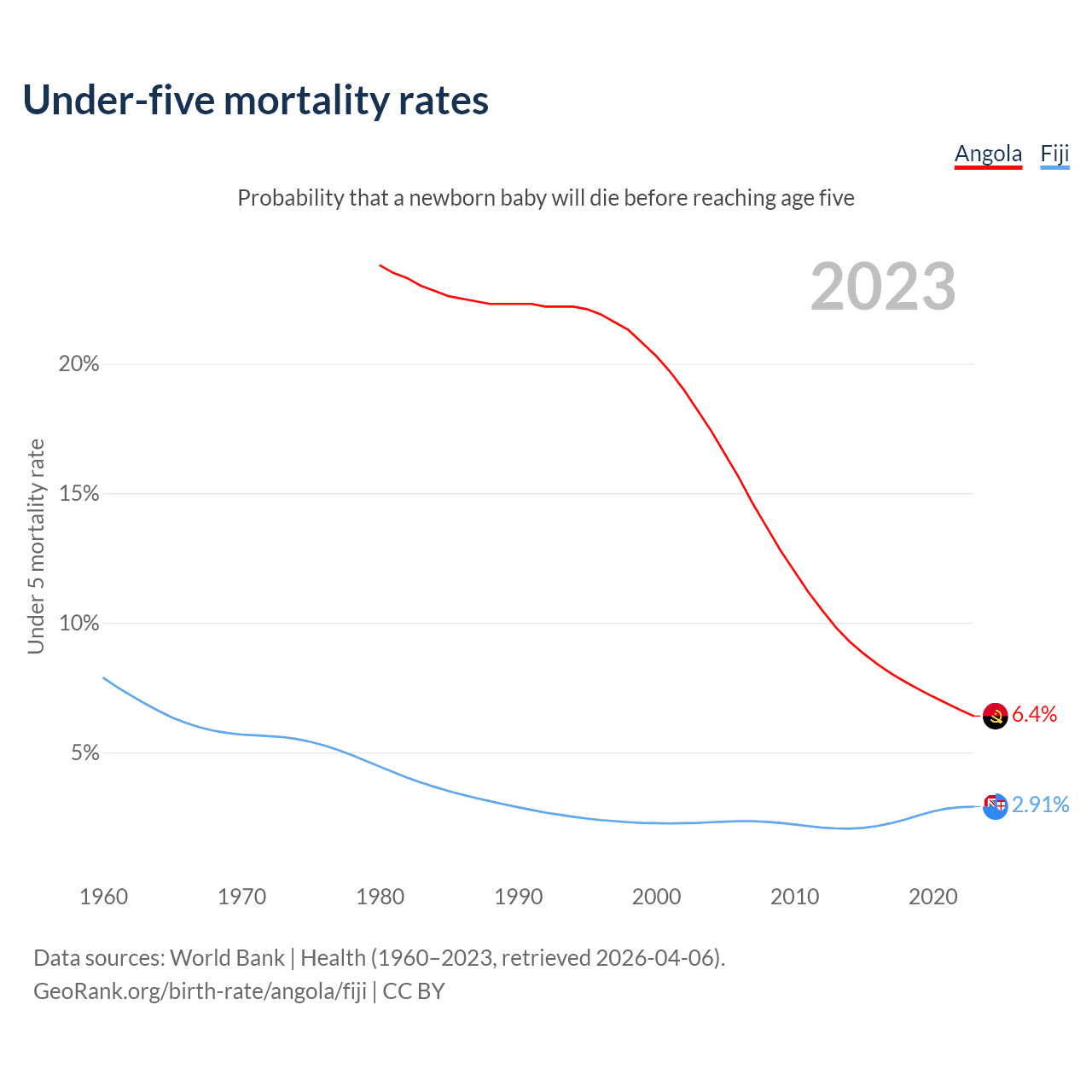 The chance that a newborn baby will die before reaching age five is 6.4% in Angola and 2.91% in Fiji. Above is a chart with historical data on under-five mortality rates.