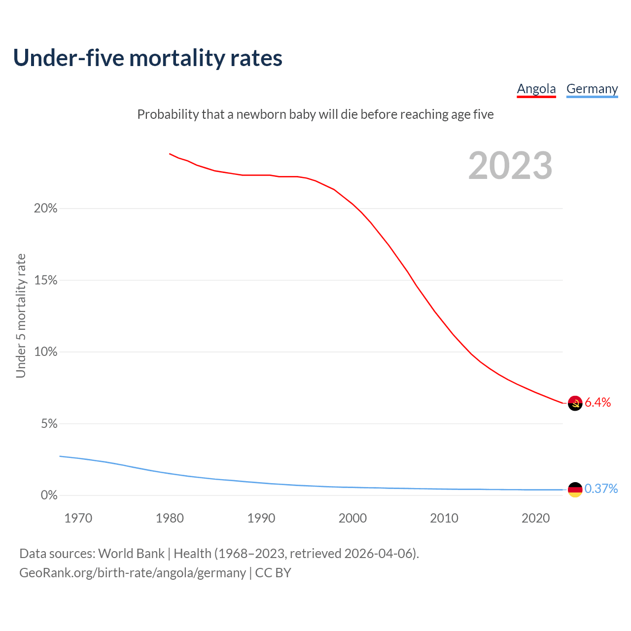 The chance that a newborn baby will die before reaching age five is 6.4% in Angola and 0.37% in Germany. Above is a chart with historical data on under-five mortality rates.