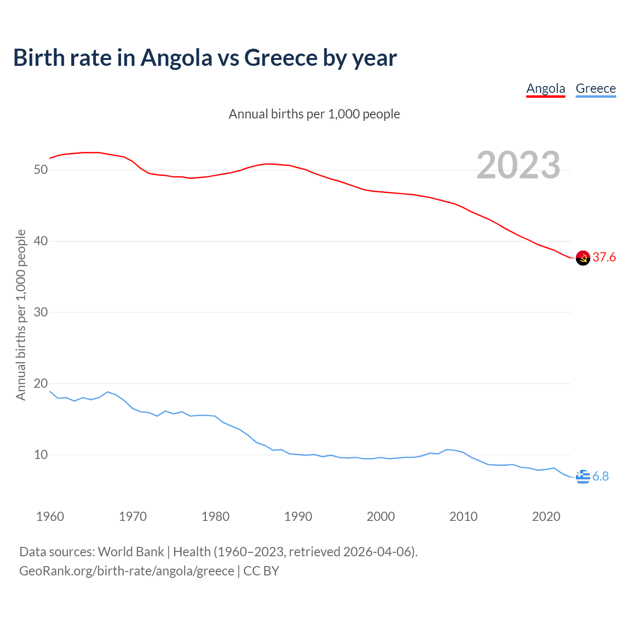 Angola has an annual birth rate of 37.6 births per 1,000 people, compared to 6.8 for Greece. The average number of children a woman is expected to have during her lifetime — the fertility rate, is 5.12 in Angola and 1.32 in Greece — 74.2% difference.