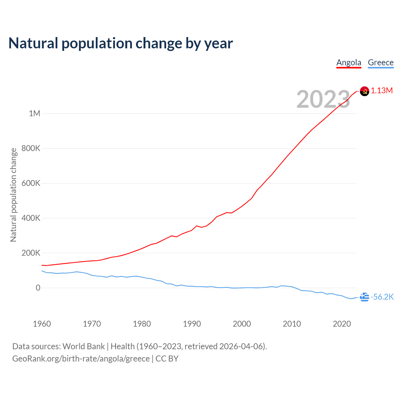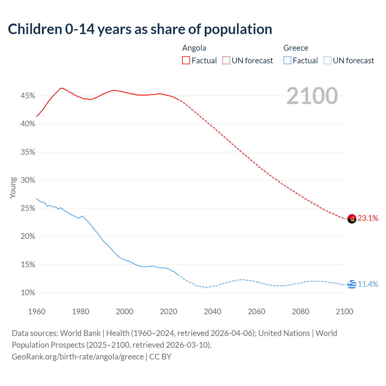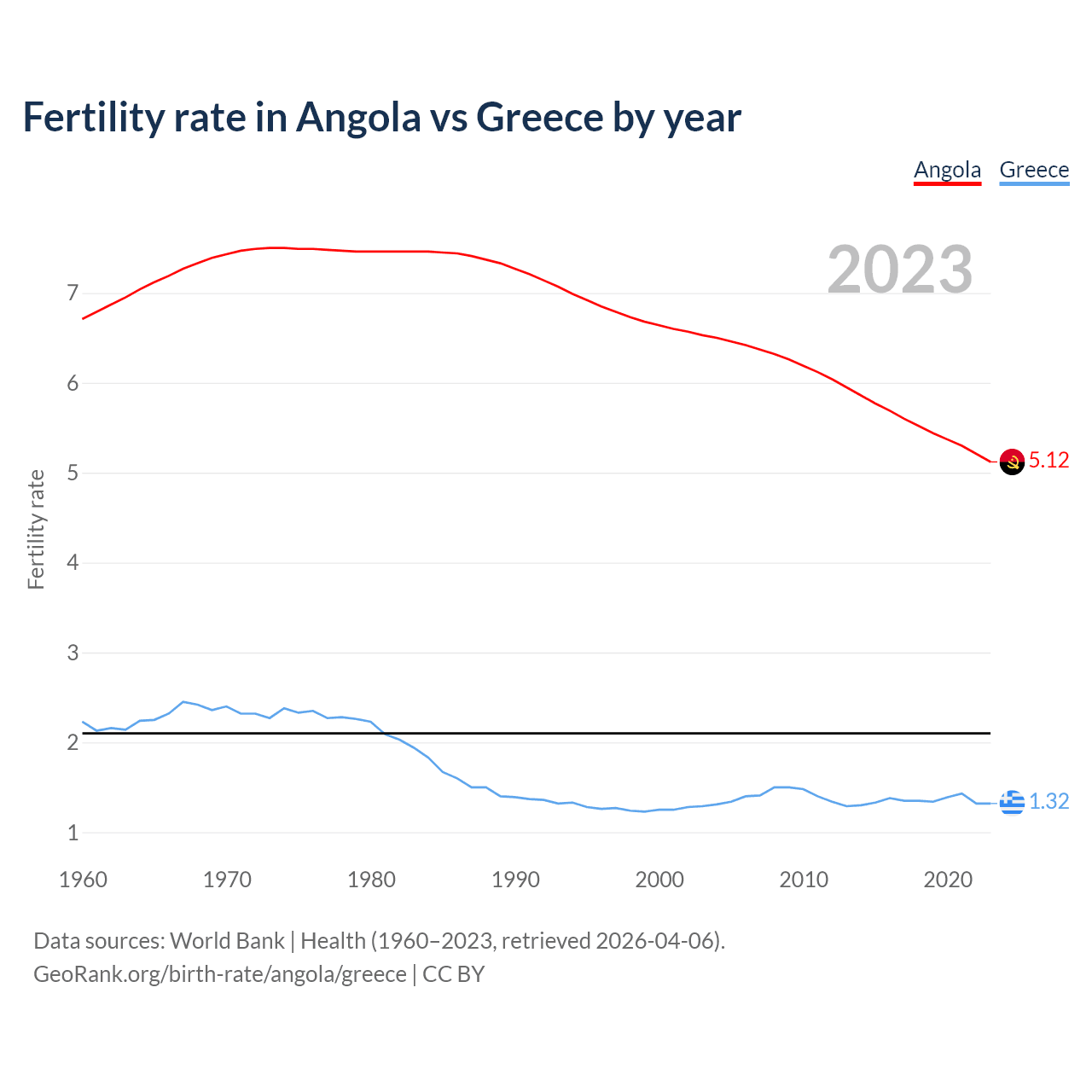 According to the latest available data on birth rates, the fertility rate in Angola was 5.12 children per woman in 2023, compared to 1.32 in Greece in 2023. The replacement level is considered to be 2.1 children per woman.