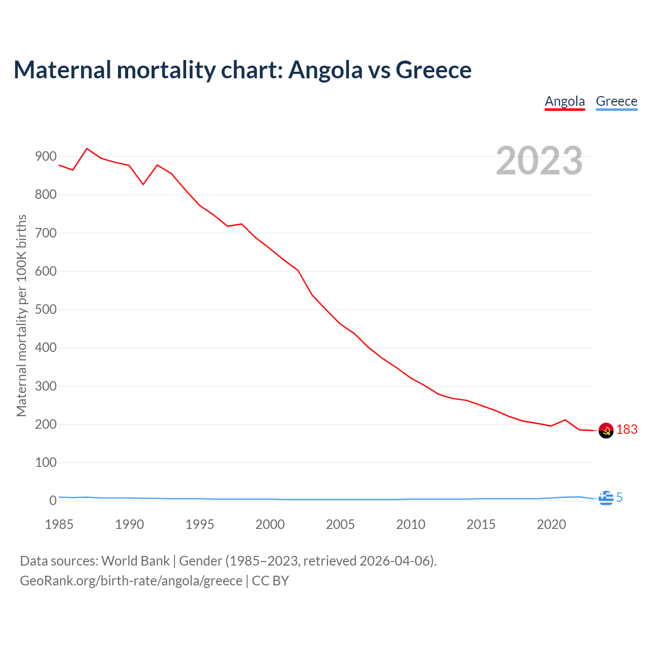 The maternal mortality rate, which is the probability of dying during childbirth or within 42 days of pregnancy termination, is 183 deaths per 100,000 live births in Angola, compared to 5 deaths in Greece.
