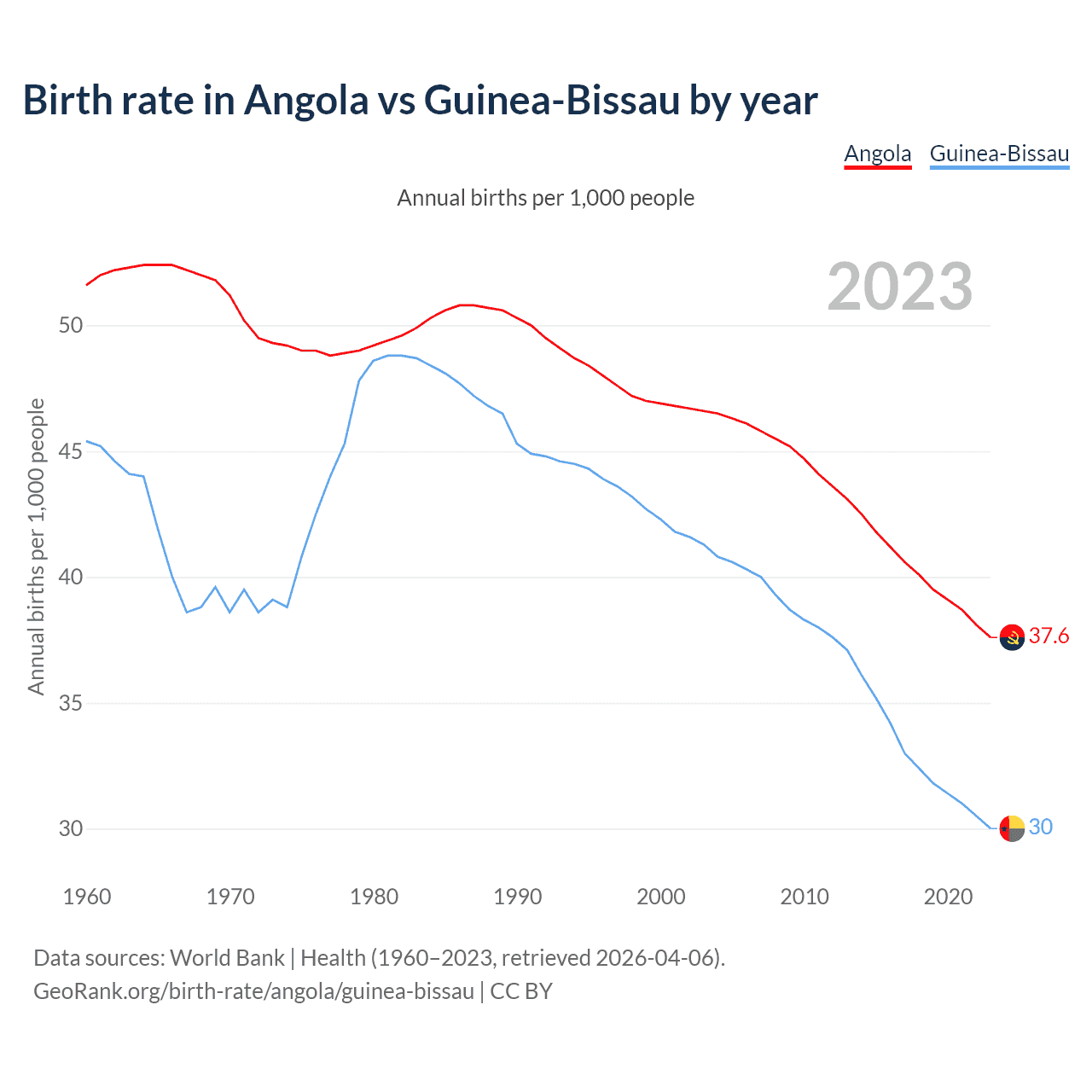 Angola has an annual birth rate of 37.6 births per 1,000 people, compared to 30 for Guinea-Bissau. The average number of children a woman is expected to have during her lifetime — the fertility rate, is 5.12 in Angola and 3.84 in Guinea-Bissau — 25.1% difference.