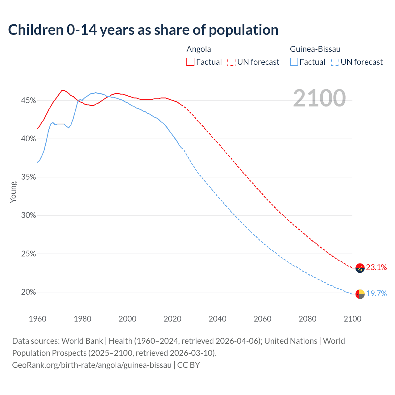 According to the latest available data on birth rates, the fertility rate in Angola was 5.12 children per woman in 2023, compared to 3.84 in Guinea-Bissau in 2023. The replacement level is considered to be 2.1 children per woman.