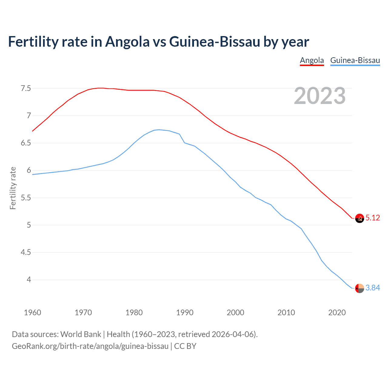 1960 vs 2023, the fertility rate has decreased by 23.6% in Angola and by 35.2% in Guinea-Bissau — in 1960, it was 6.71 and 5.92, respectively.
