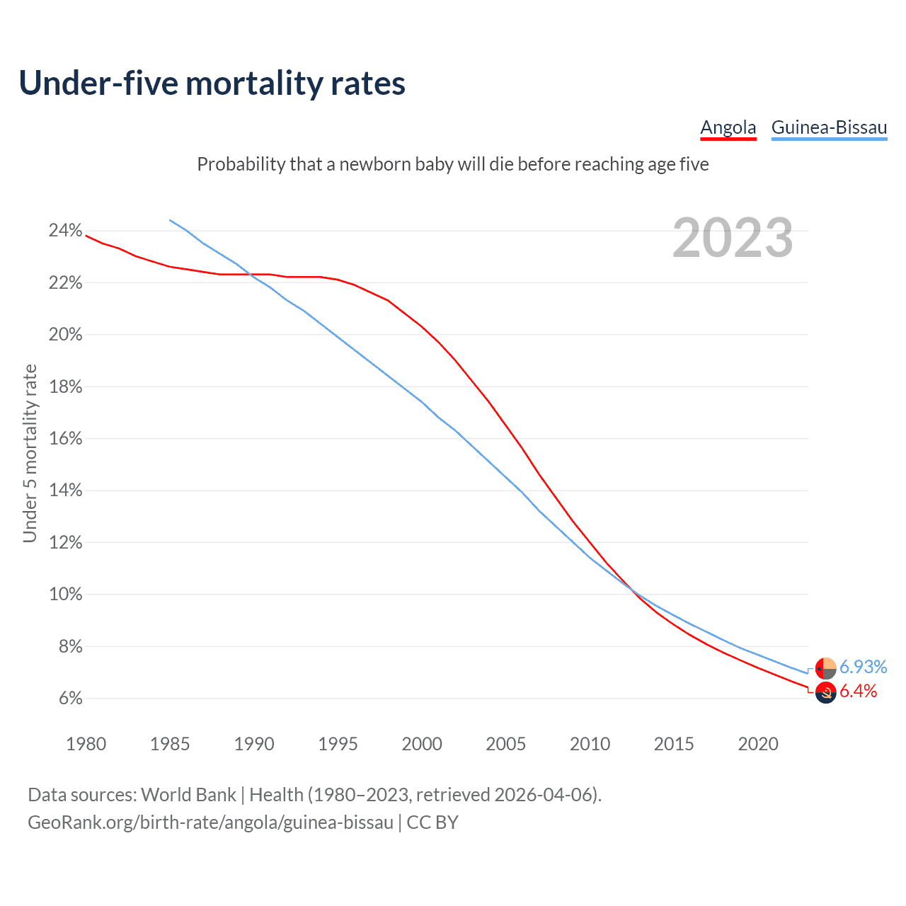 The chance that a newborn baby will die before reaching age five is 6.4% in Angola and 6.93% in Guinea-Bissau. Above is a chart with historical data on under-five mortality rates.