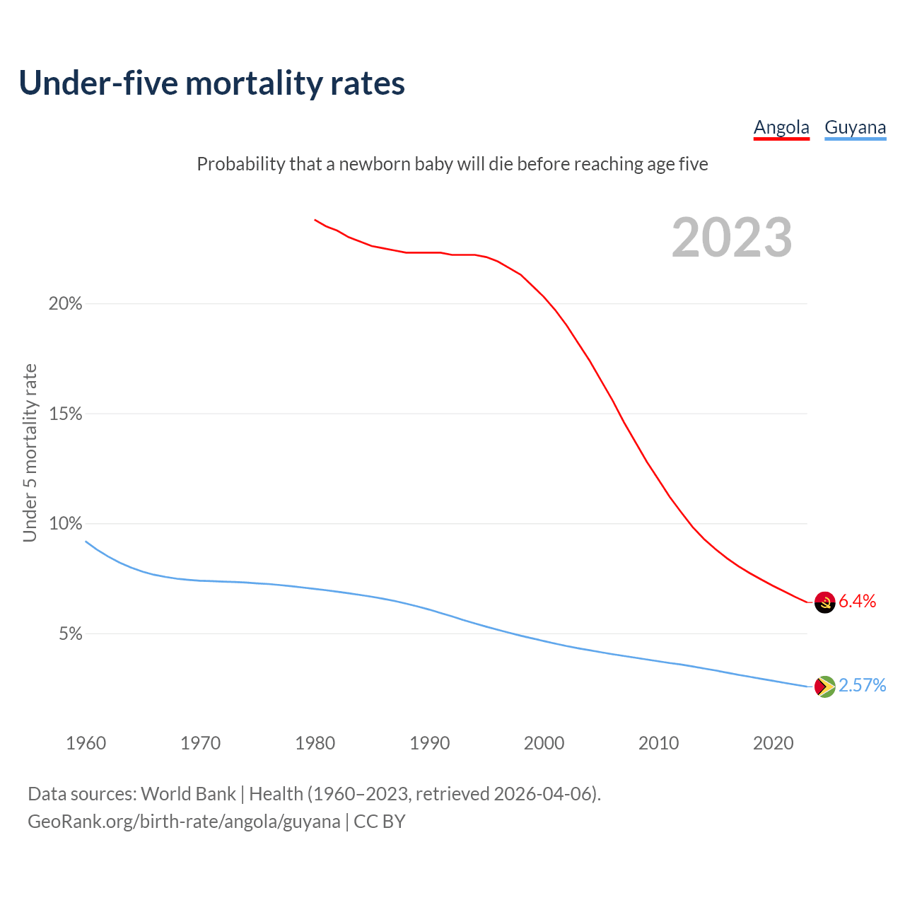 The chance that a newborn baby will die before reaching age five is 6.4% in Angola and 2.57% in Guyana. Above is a chart with historical data on under-five mortality rates.