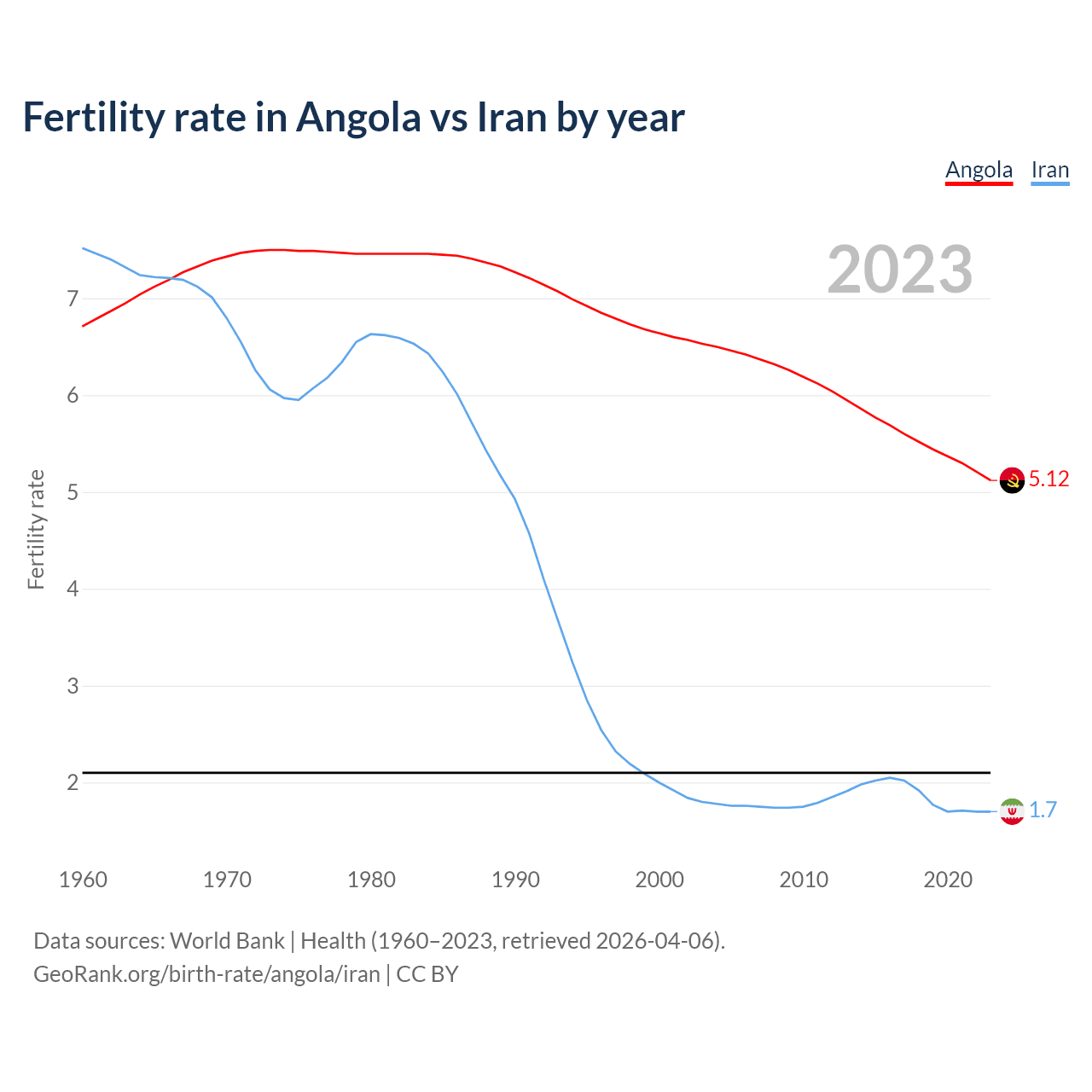 1960 vs 2023, the fertility rate has decreased by 23.6% in Angola and by 77.5% in Iran — in 1960, it was 6.71 and 7.52, respectively.