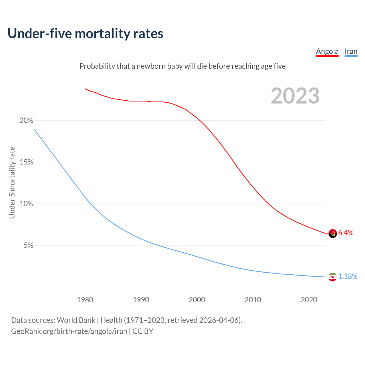The chance that a newborn baby will die before reaching age five is 6.4% in Angola and 1.18% in Iran. Above is a chart with historical data on under-five mortality rates.