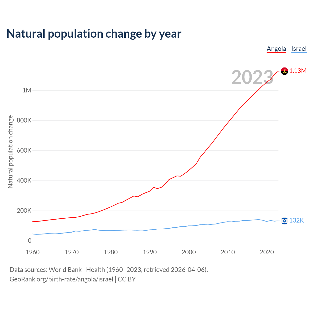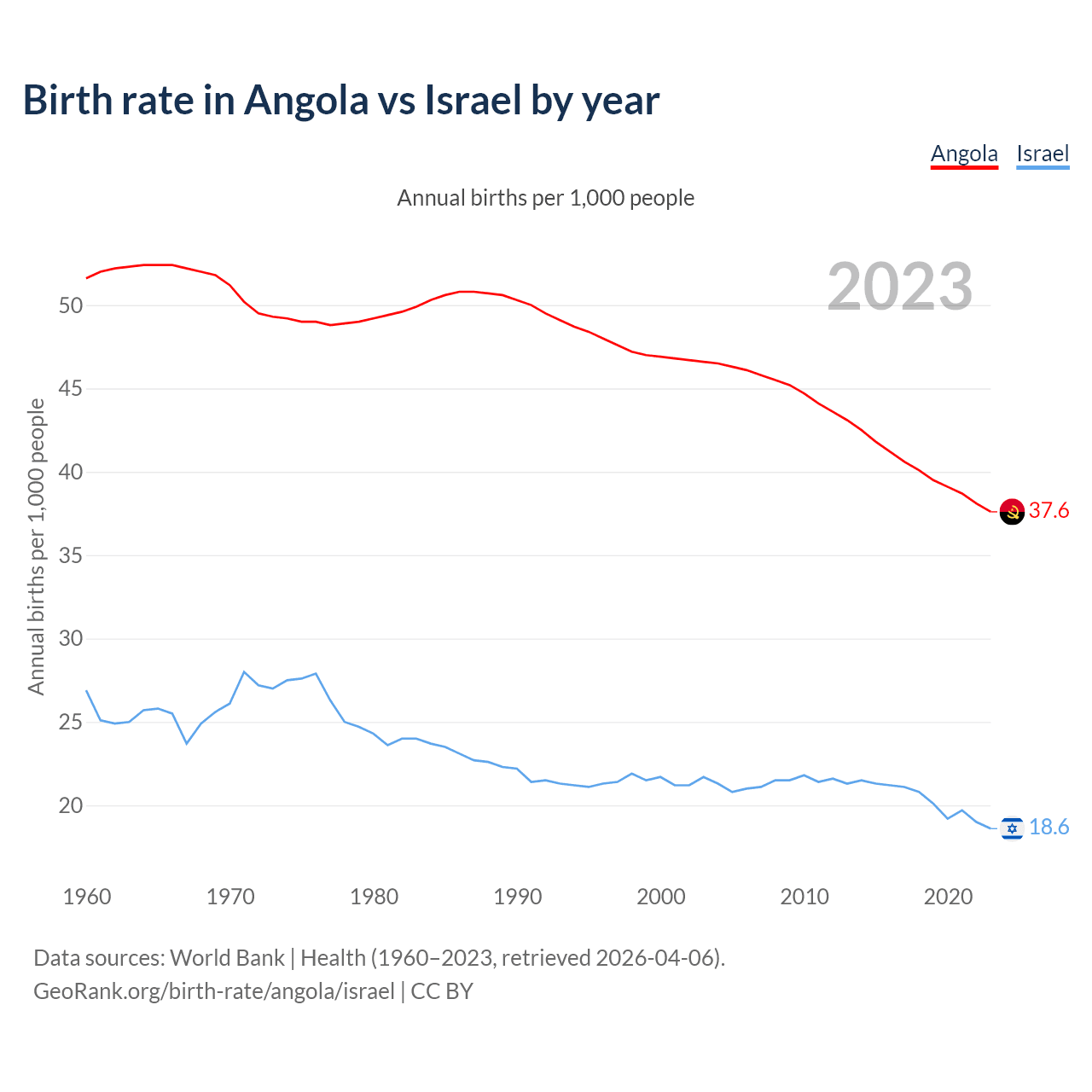 Angola has an annual birth rate of 37.6 births per 1,000 people, compared to 18.6 for Israel. The average number of children a woman is expected to have during her lifetime — the fertility rate, is 5.12 in Angola and 2.85 in Israel — 44.4% difference.