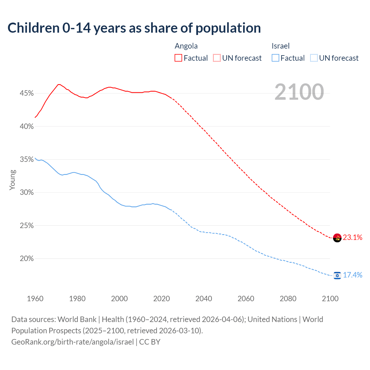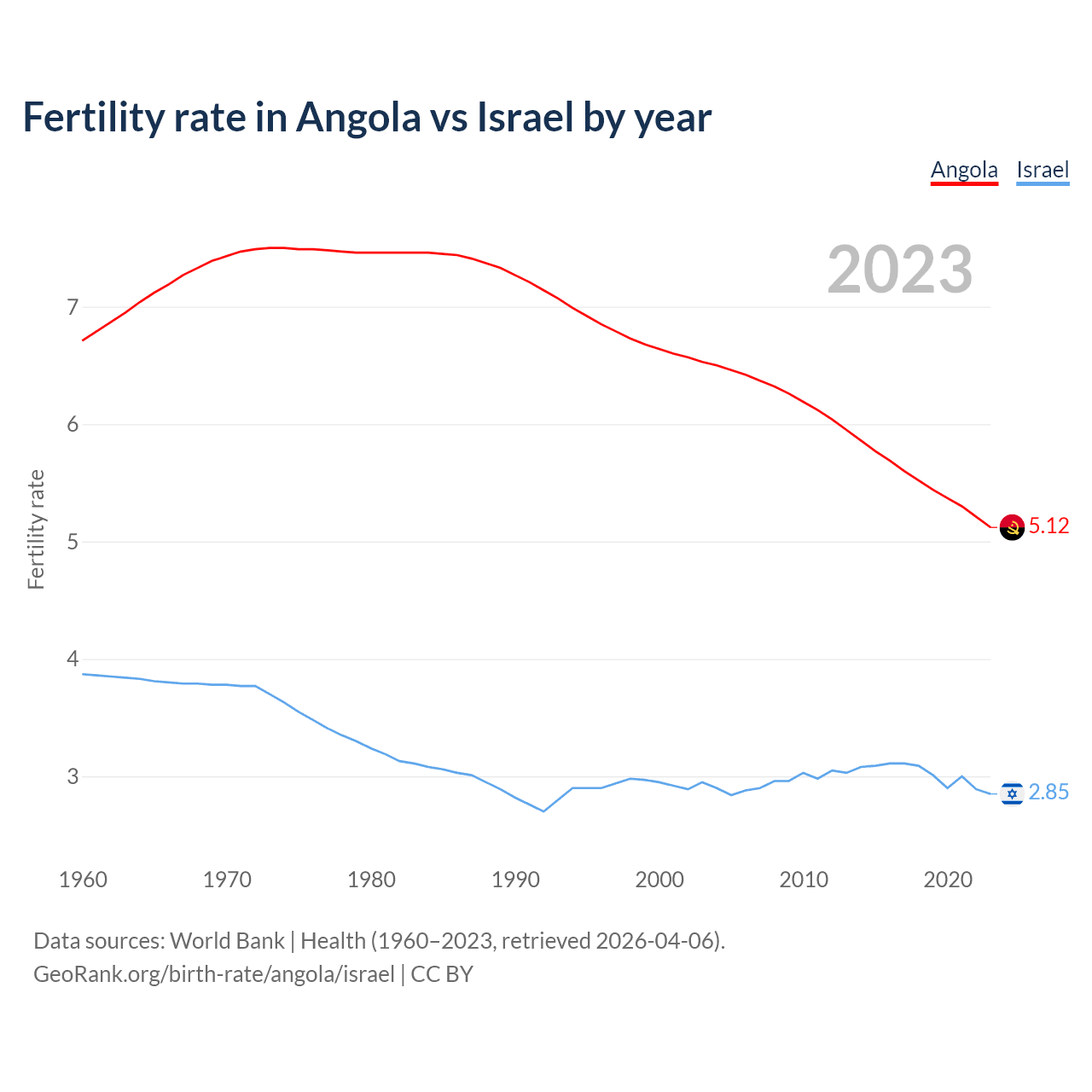 According to the latest available data on birth rates, the fertility rate in Angola was 5.12 children per woman in 2023, compared to 2.85 in Israel in 2023. The replacement level is considered to be 2.1 children per woman.