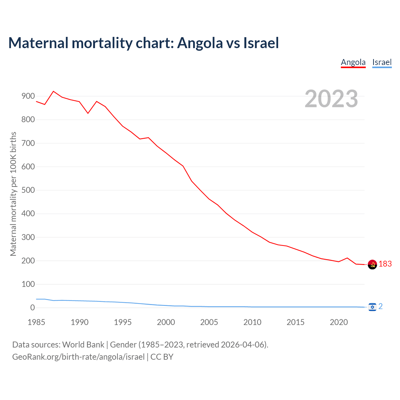 The maternal mortality rate, which is the probability of dying during childbirth or within 42 days of pregnancy termination, is 183 deaths per 100,000 live births in Angola, compared to 2 deaths in Israel.