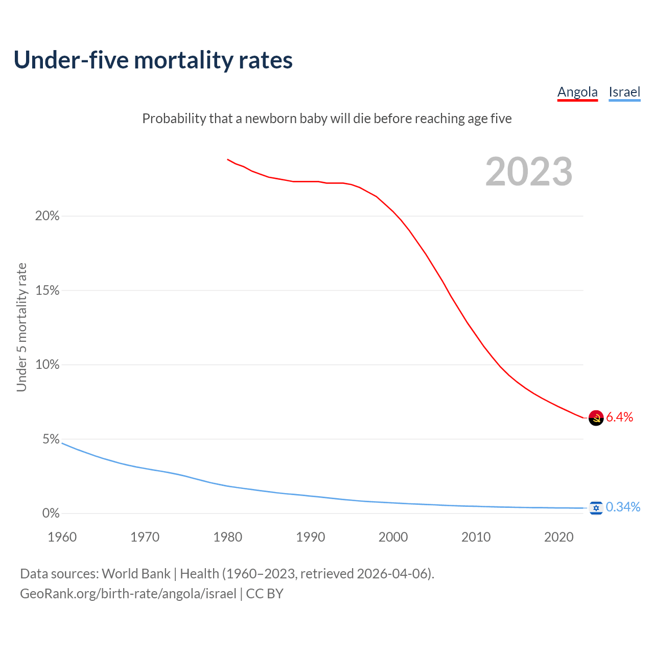 The chance that a newborn baby will die before reaching age five is 6.4% in Angola and 0.34% in Israel. Above is a chart with historical data on under-five mortality rates.