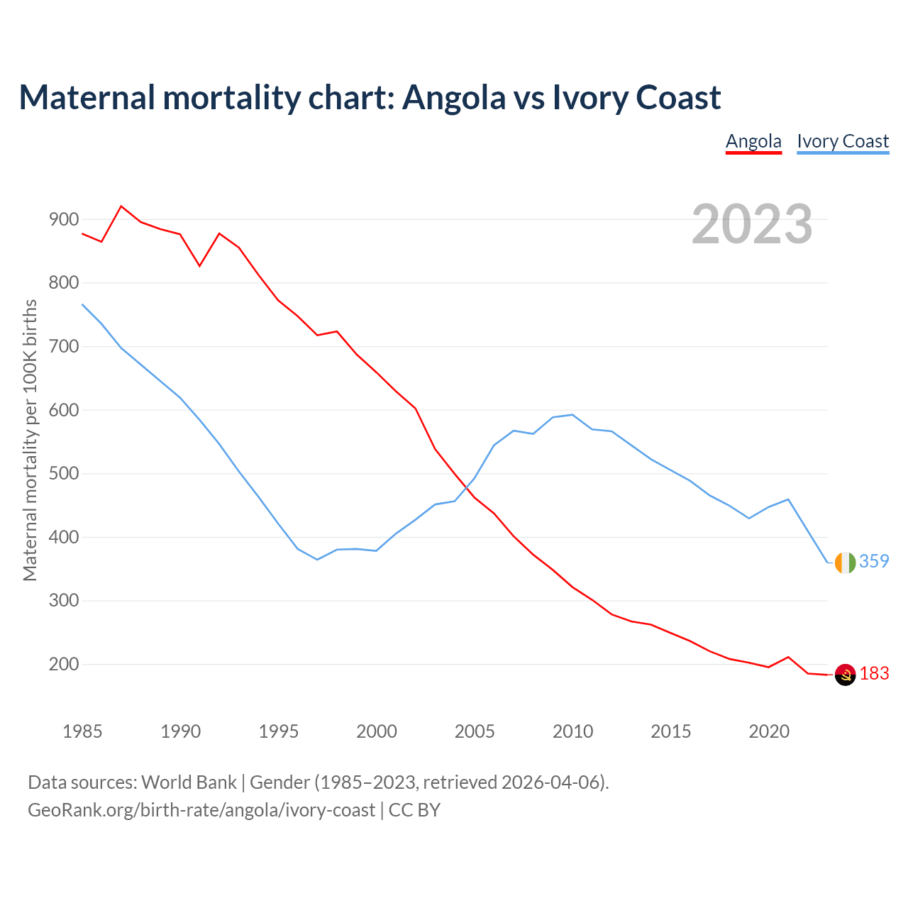 The maternal mortality rate, which is the probability of dying during childbirth or within 42 days of pregnancy termination, is 183 deaths per 100,000 live births in Angola, compared to 359 deaths in Ivory Coast.