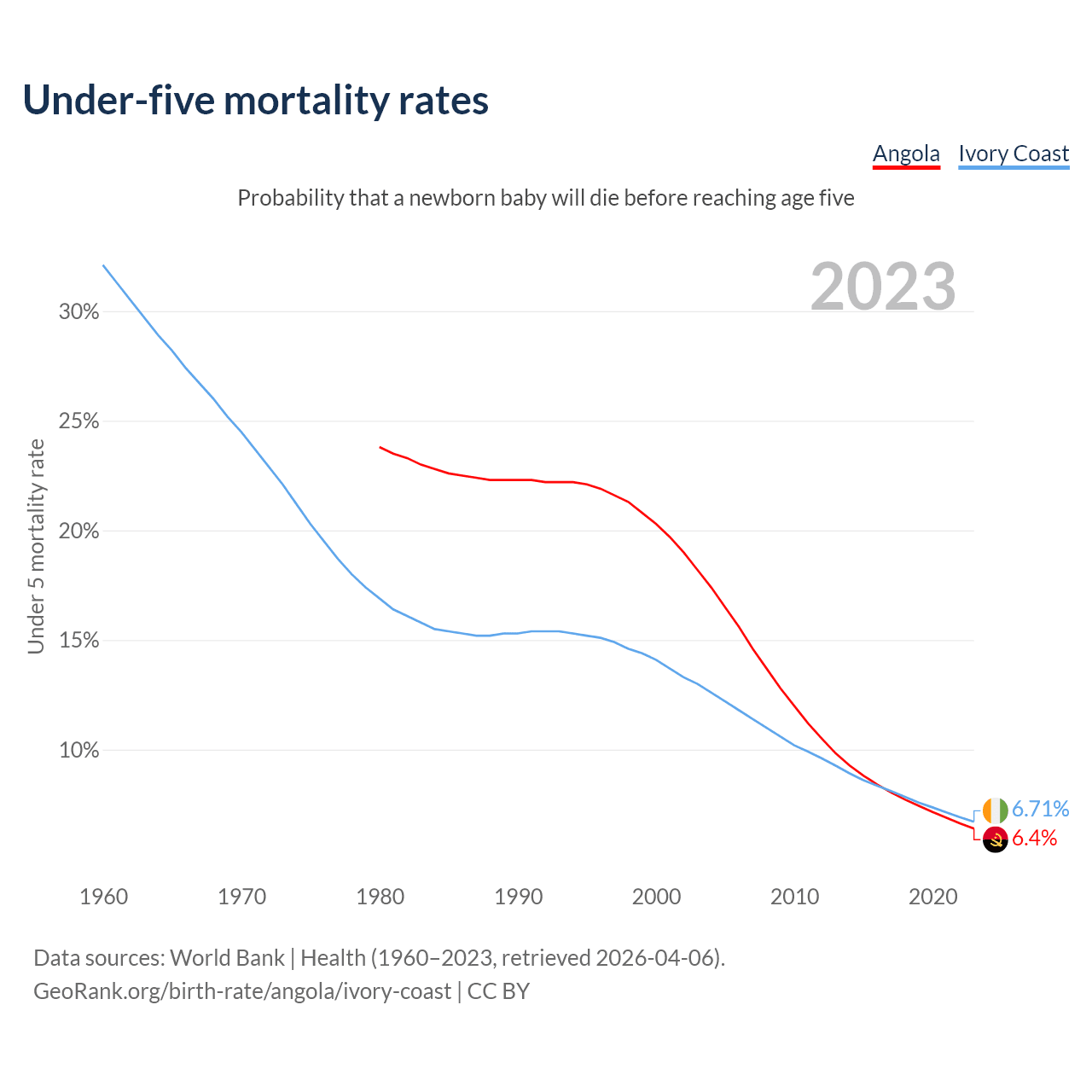 The chance that a newborn baby will die before reaching age five is 6.4% in Angola and 6.71% in Ivory Coast. Above is a chart with historical data on under-five mortality rates.