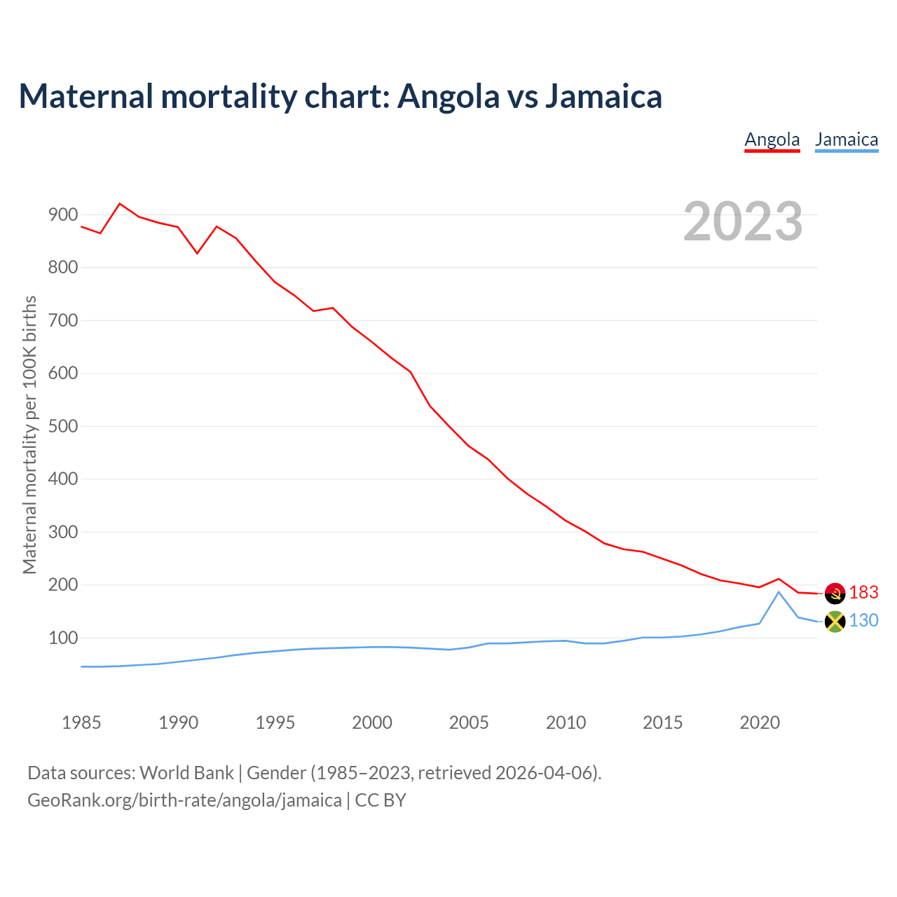 The maternal mortality rate, which is the probability of dying during childbirth or within 42 days of pregnancy termination, is 183 deaths per 100,000 live births in Angola, compared to 130 deaths in Jamaica.