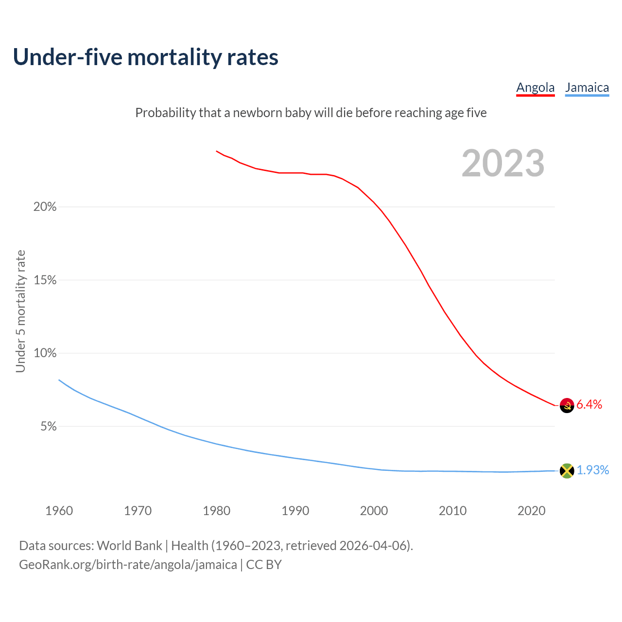 The chance that a newborn baby will die before reaching age five is 6.4% in Angola and 1.93% in Jamaica. Above is a chart with historical data on under-five mortality rates.