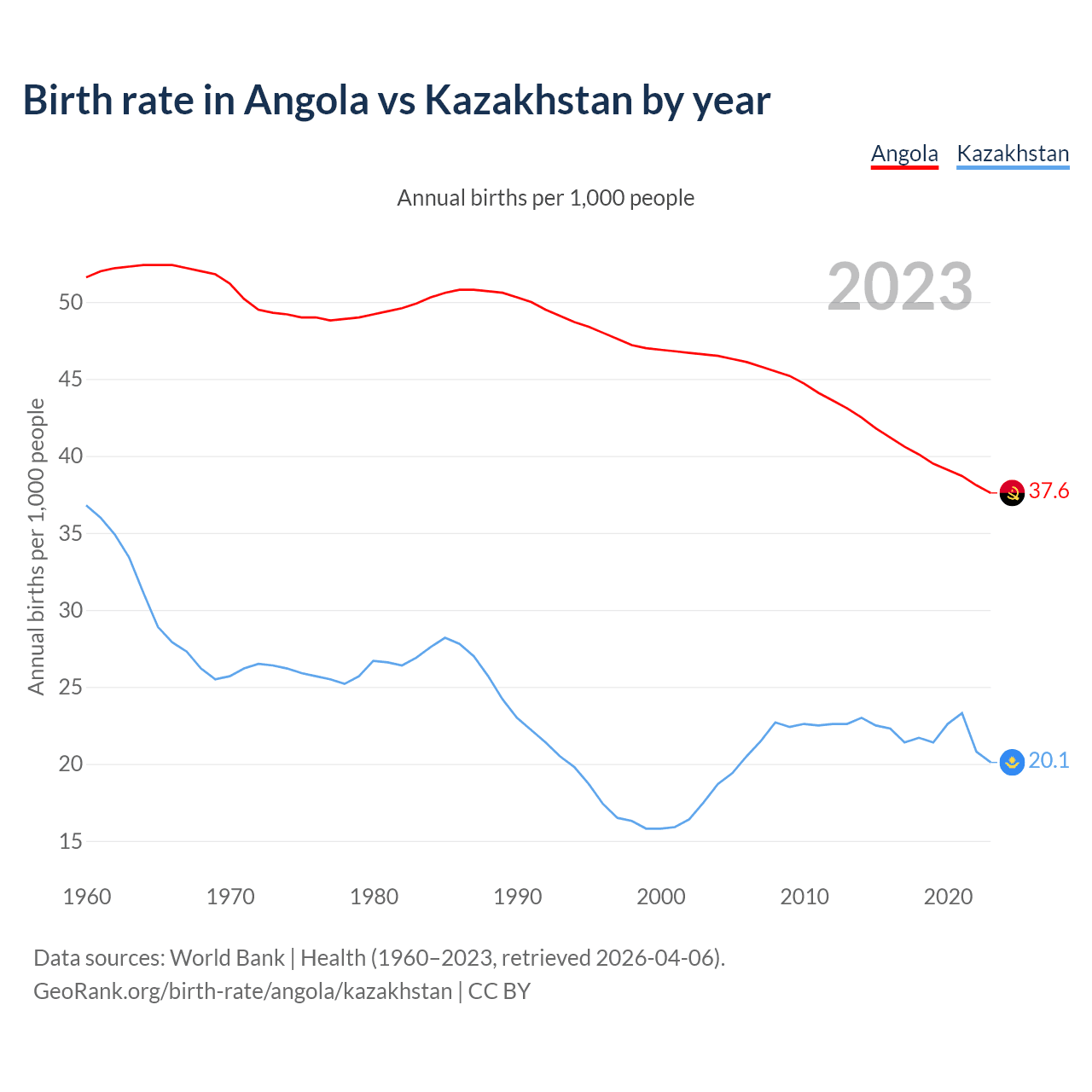Angola has an annual birth rate of 37.6 births per 1,000 people, compared to 20.1 for Kazakhstan. The average number of children a woman is expected to have during her lifetime — the fertility rate, is 5.12 in Angola and 3.01 in Kazakhstan — 41.2% difference.