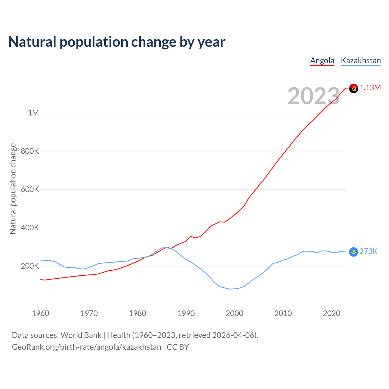 According to the latest available data on birth rates, the fertility rate in Angola was 5.12 children per woman in 2023, compared to 3.01 in Kazakhstan in 2023. The replacement level is considered to be 2.1 children per woman.